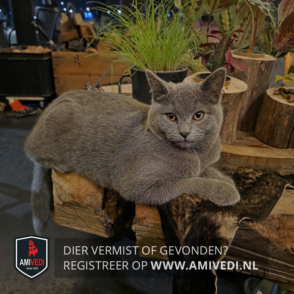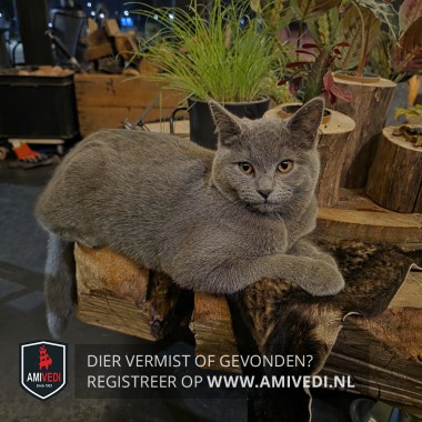 | Signalement | Volledig grijs, oranje - bruine ogen. |