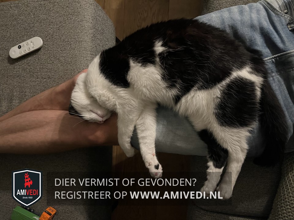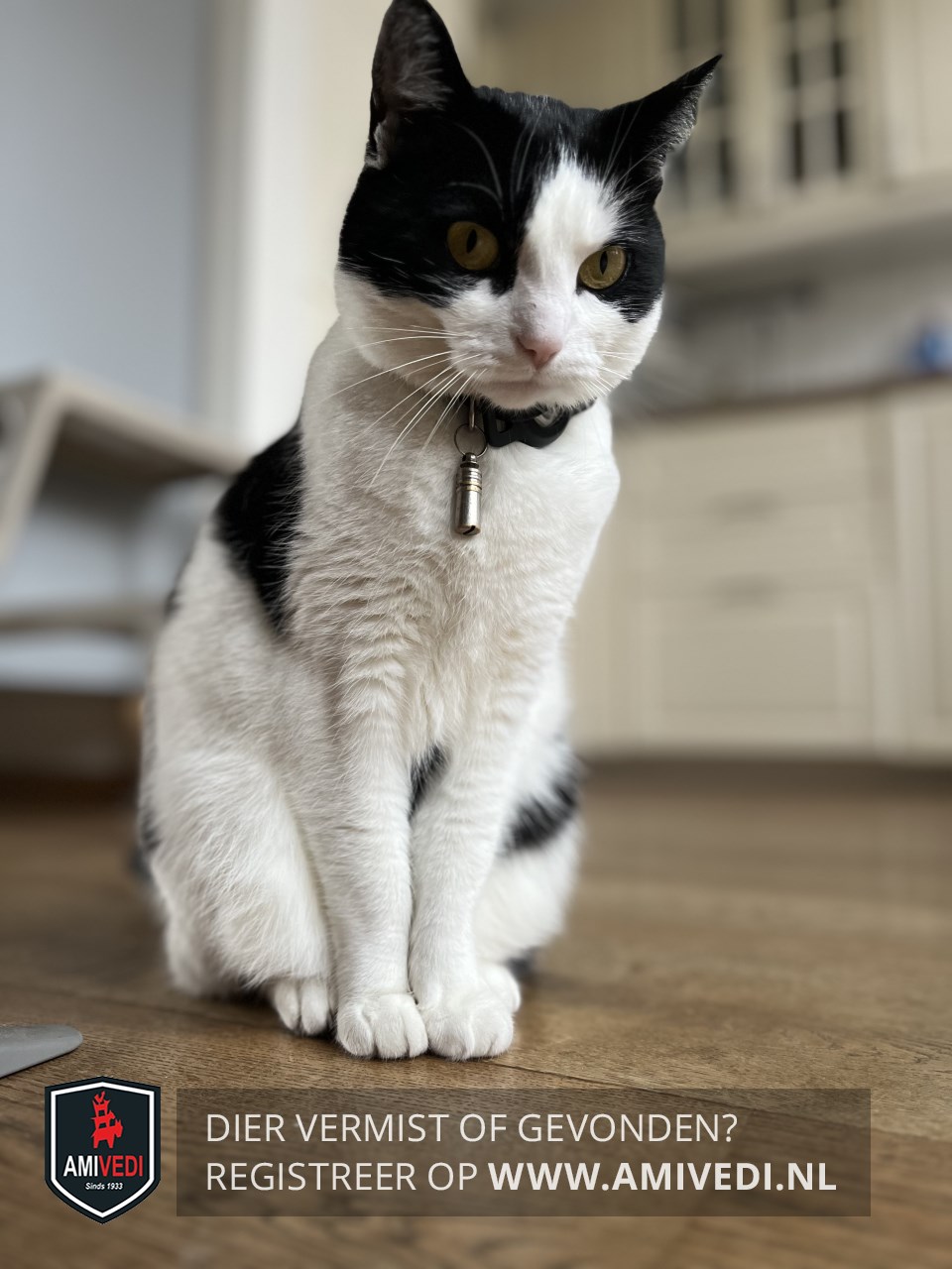 | Signalement | Wit met zwarte poes, zwart rond de ogen en oren, zwart op de rug en staart, zwarte vlek op de rechter achterpoot. Klein van stuk halsband met adres en air tag. |