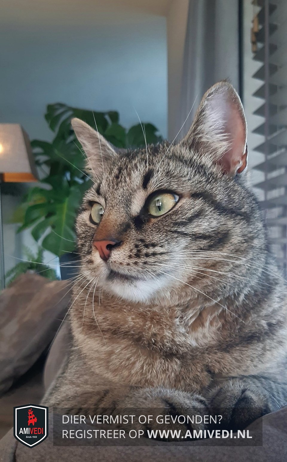 | Signalement | Volledig cypers bruin/zwart/grijs. Lichte kin. Punt van de staart zwart. |