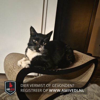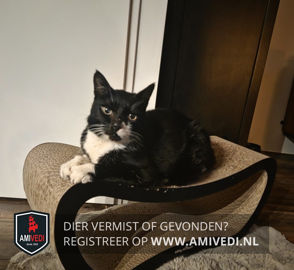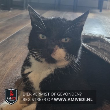 | Signalement | Zwarte kater met witte vlek links naast de neus. Onder de zwarte bek een witte smalle streep naar rechts eindigend bij de wang, wit loopt ook links door naar de witte vlek naast de neus. Witte bef en borst. Groene gele ogen. Zwarte rug en zijflanken. Beide voorpoten zwart met witte kousjes. Hij heeft diabetes en heeft een opgezette buik. |