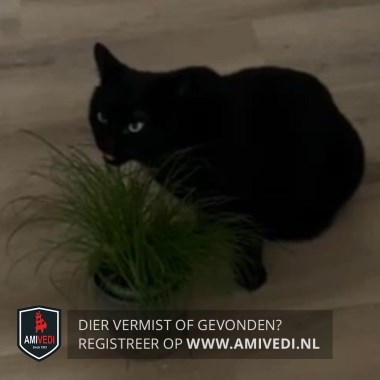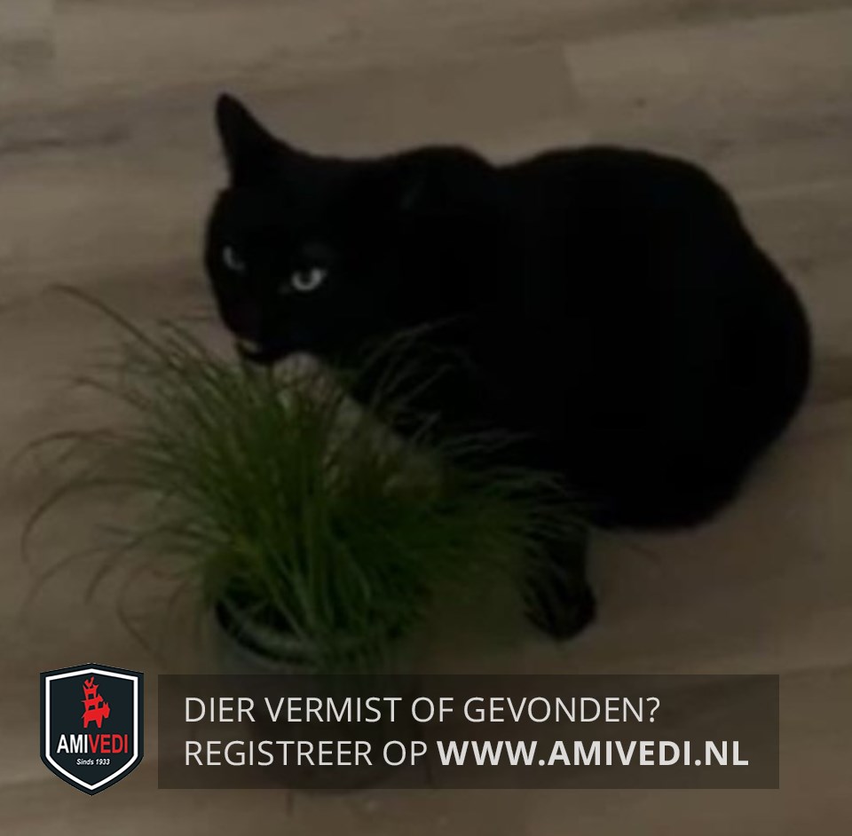 | Signalement | Helemaal zwart Een ietsiepietsie wit vlekje onder z’n nekje Hangbuikje |