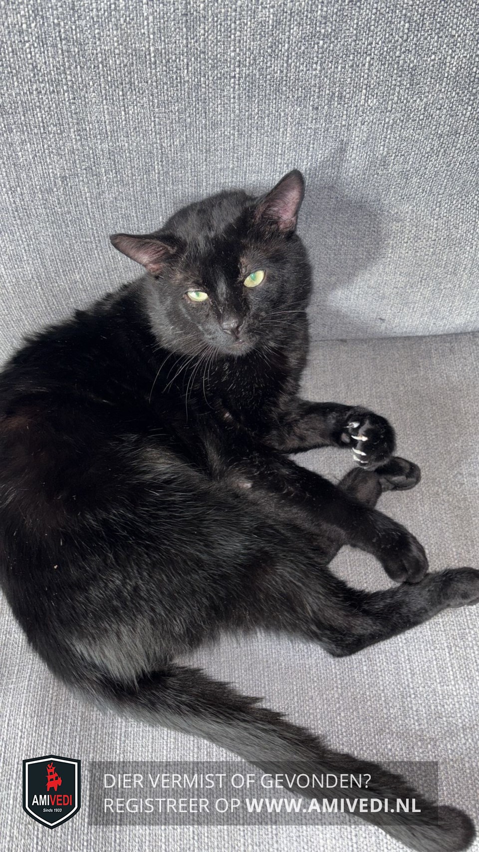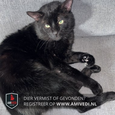 | Signalement | Geheel zwart, hij heeft een witte vlek/schram op z’n rechtervoorpoot en hij heeft een kromme staart |