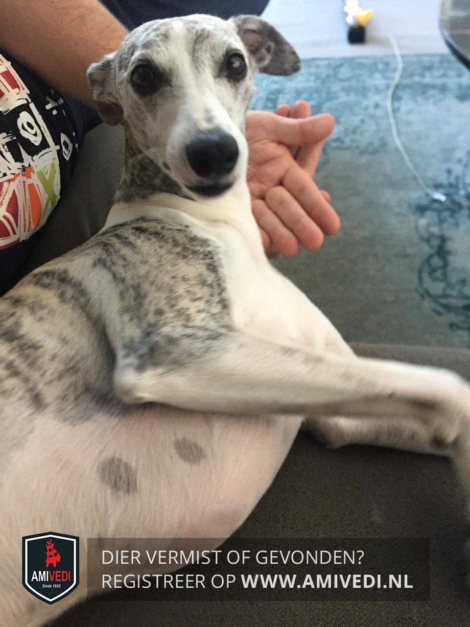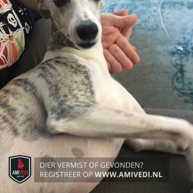 | Signalement | Whippet, wit met grijs-beige op kopje en oren, grijs-beige plekken op lijf. |
