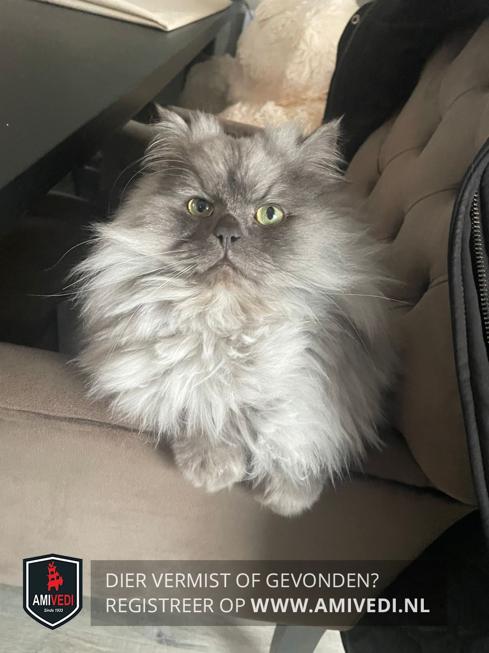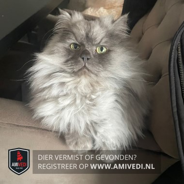 | Signalement | Grijs/wit lang haar, donkerdere kop. Kruising perzisch/rag doll. |
