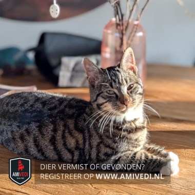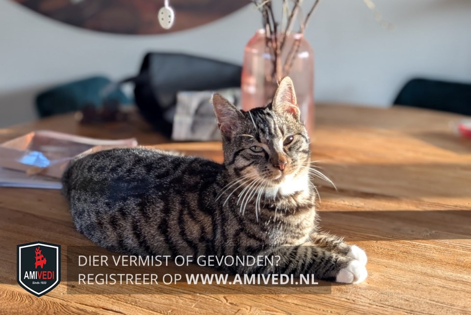 | Signalement | Cypers bruin/grijs/zwart katertje. Bruin neusje, wit befje en witte teentjes. |