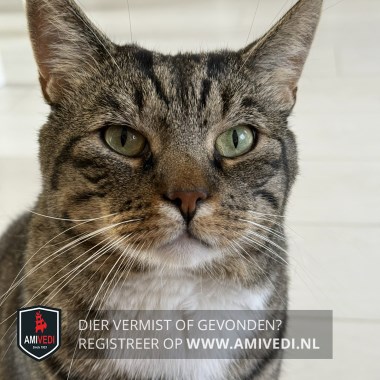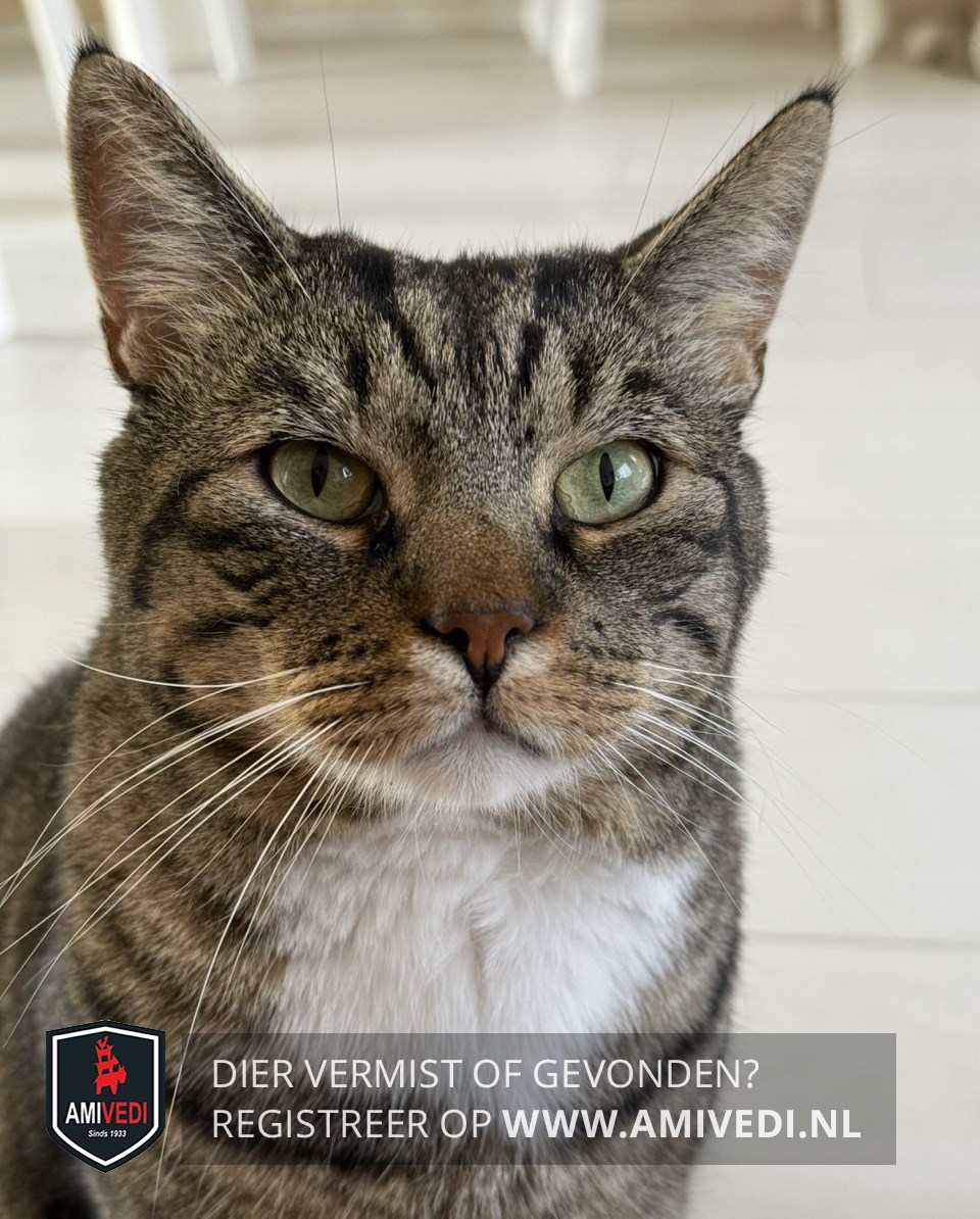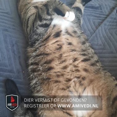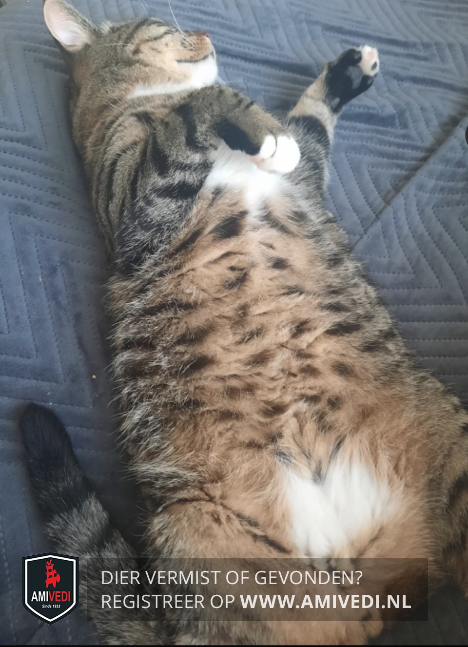 | Signalement | Cypers bruinzwart gestreepte kater met lichte kin en witte bef. Enkele witte teentjes aan de linkervoorpoot, alle teentjes wit aan de rechtervoorpoot. Achterkant van beide voorpootjes tot en met de voetkussentjes is donker. Het wit van de bef loopt door tot tussen de voorpoten, wit vlak op de buik thv de liezen. Staart is licht cypers gestreept met een zwarte punt |