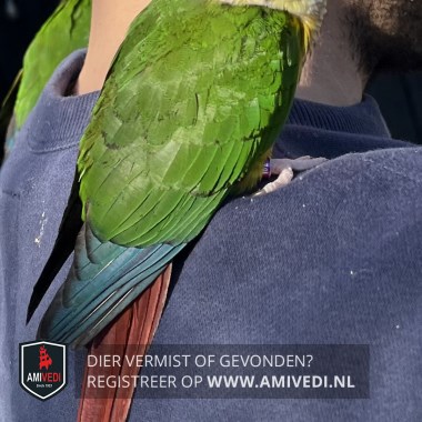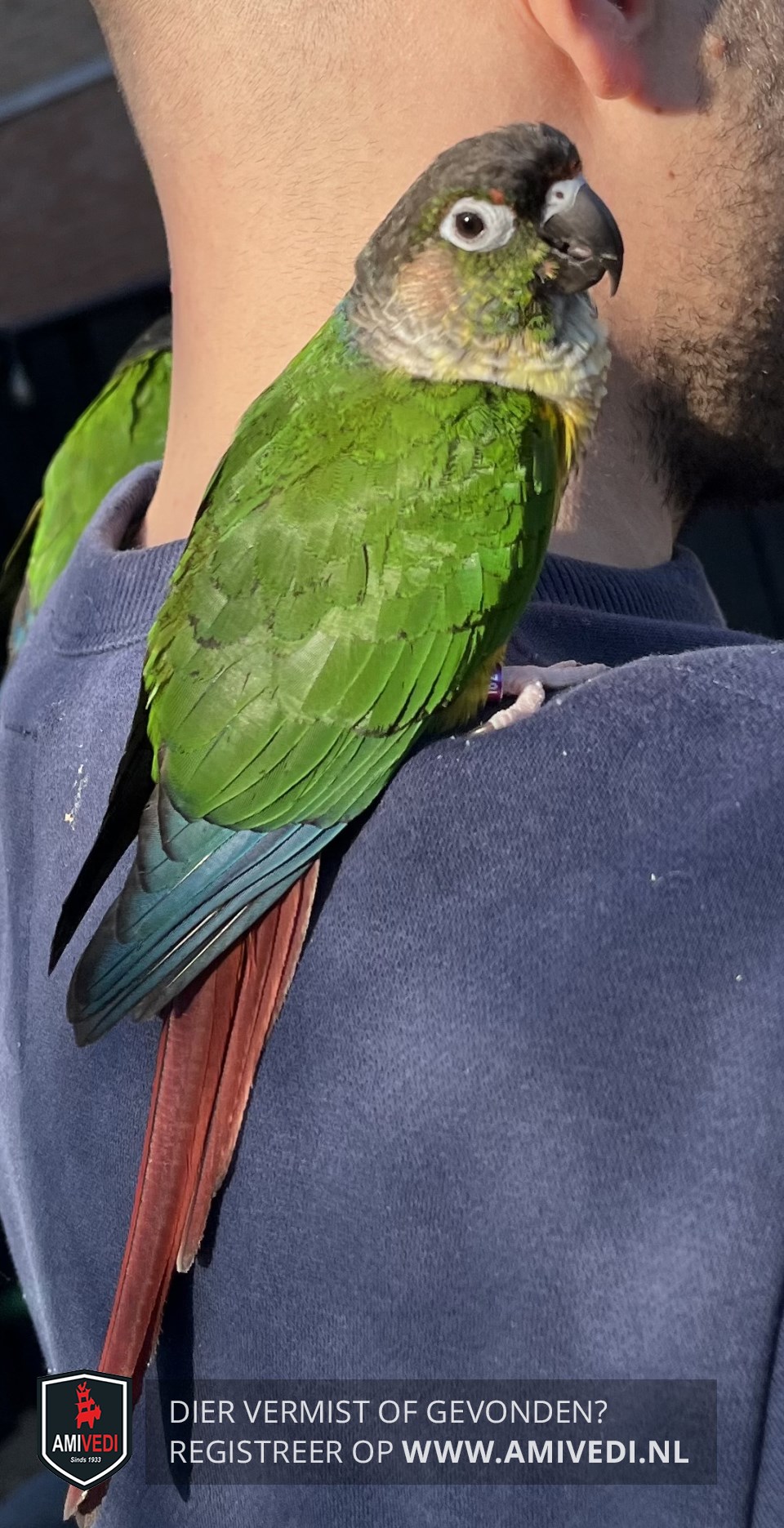 | Signalement | Groenwangparkiet/Pyrrhura Grijs kopje, groene wangetjes, creme met waas van groen op de keel, vaal gele borst, groene rug, groene vleugels met zwart/blauwe eindveren, rode staart. |