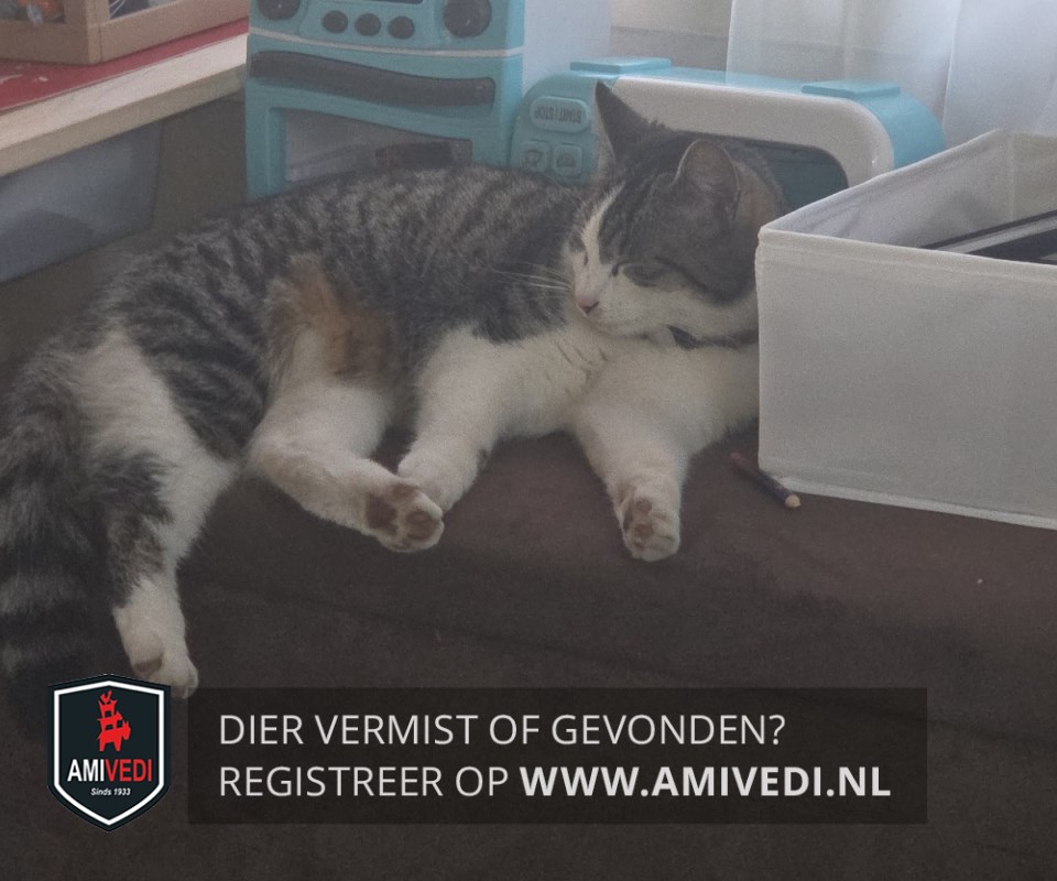 | Signalement | Cypers grijs - zwart met witte bles en snuit, lichtgrijs vlekje links onder de neus, witte bef, witte voorpoten, linker achterpoot wit, rechter achterpoot wit met grote cyperse vlek aan de hiel, vleugje bruin bij de buik, cyperse staart in ring patroon. |