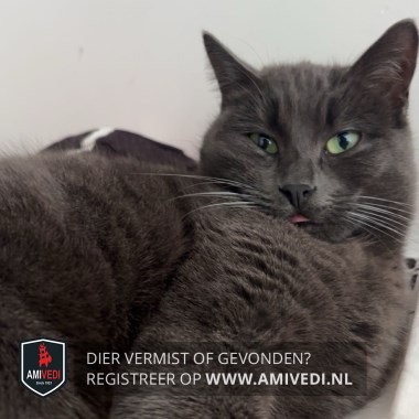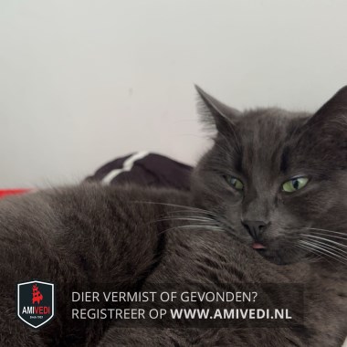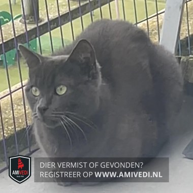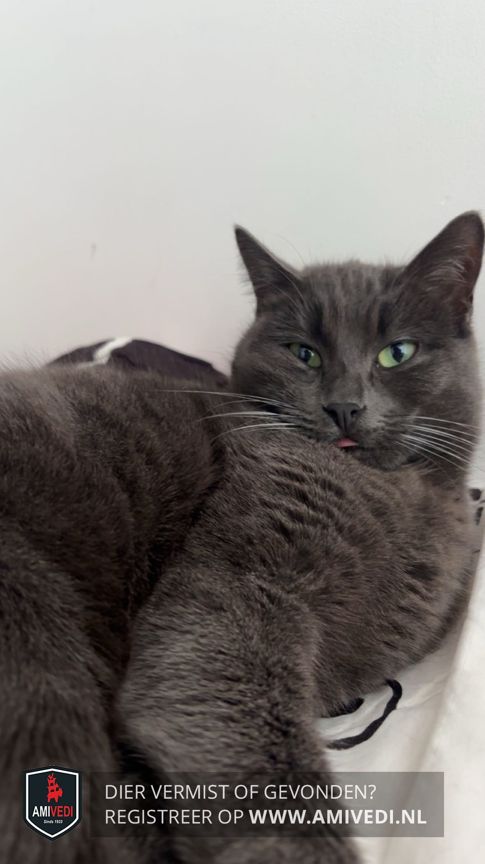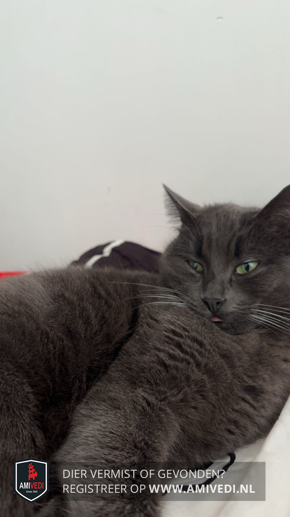| Signalement | Egaal grijze kater, geen andere kleuren met groene ogen. |