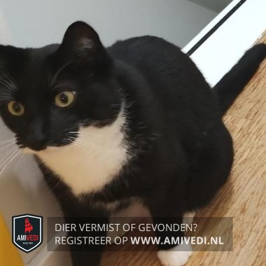 | Signalement | Zwart met witte accenten: witte snorharen, witte onderlip, kin en bef. Witte voetjes voorpootjes, witte sokjes achterpootjes. |