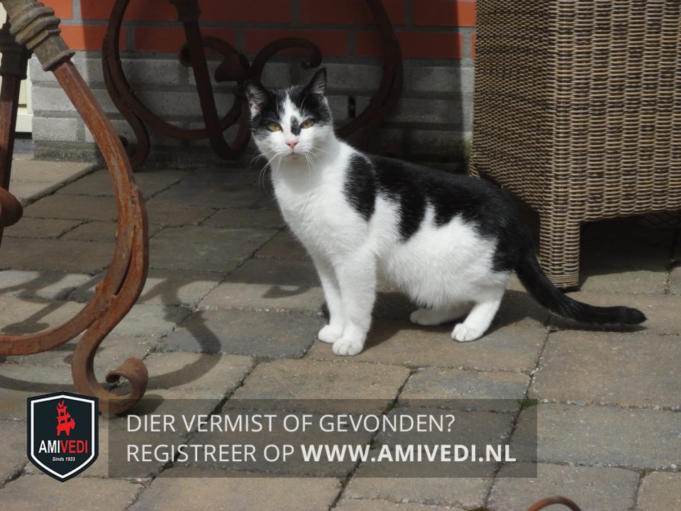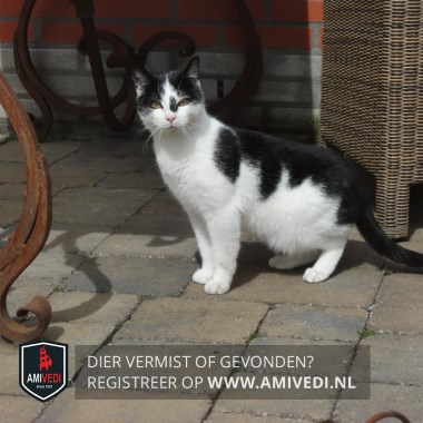 | Signalement | Zwart met wit, zwarte oren en er omheen, zwarte vlek links naast de neus. zwarte vlek op linker schouder, zwarte rug, zwarte staart aan het eind een knik. |