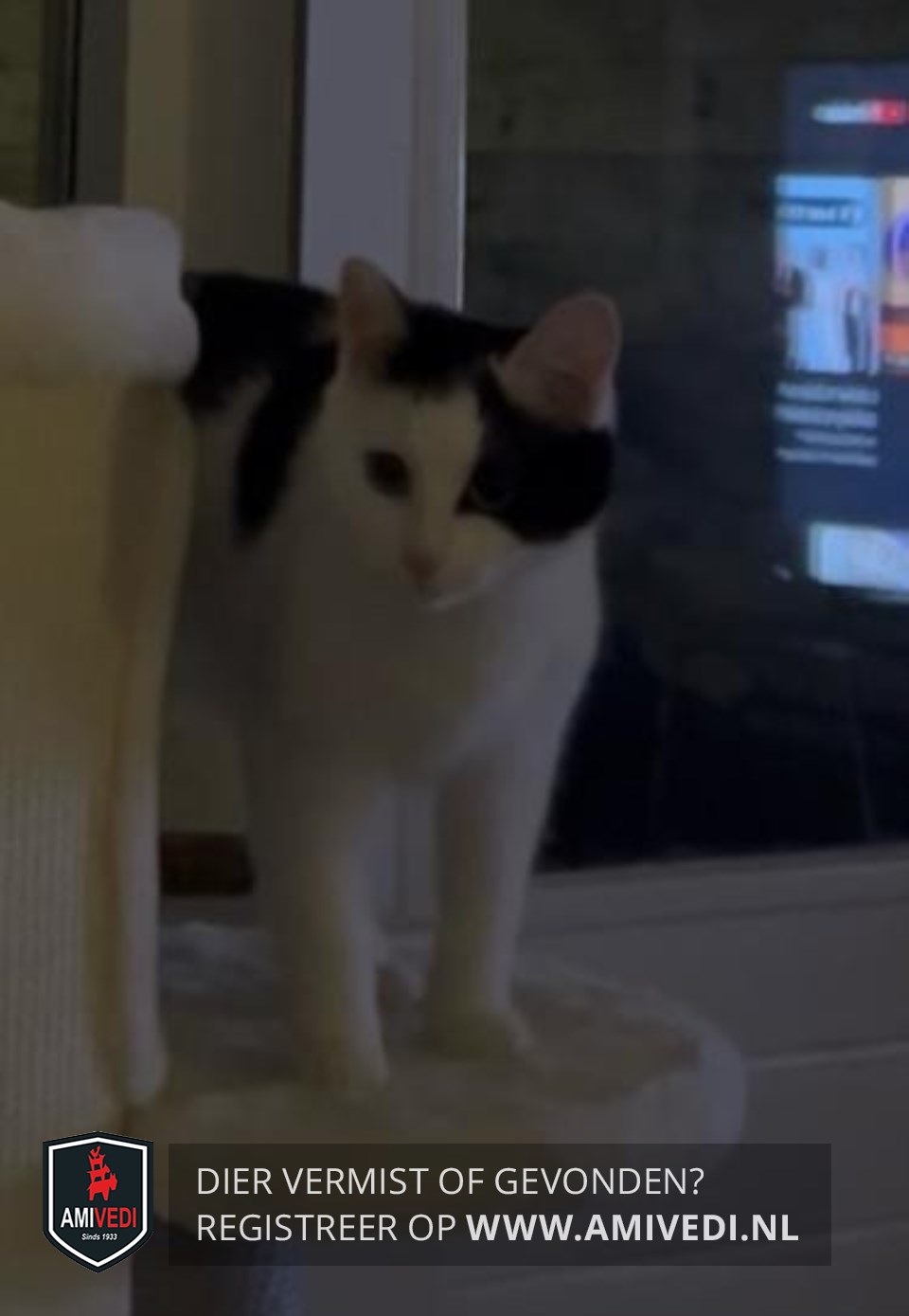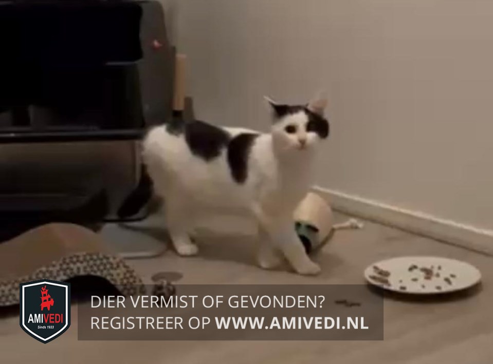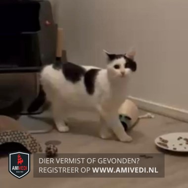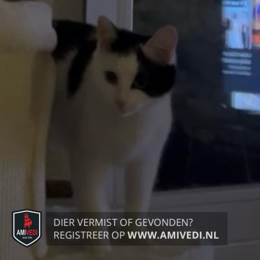 | Signalement | Witte poes, Zwart op het kopje dat doorloopt met een grote zwarte vlak over en langs het linker oogje over de slapen. Verder wit snuitje. Zwarte vlekken op de rug. Zwarte staart. |