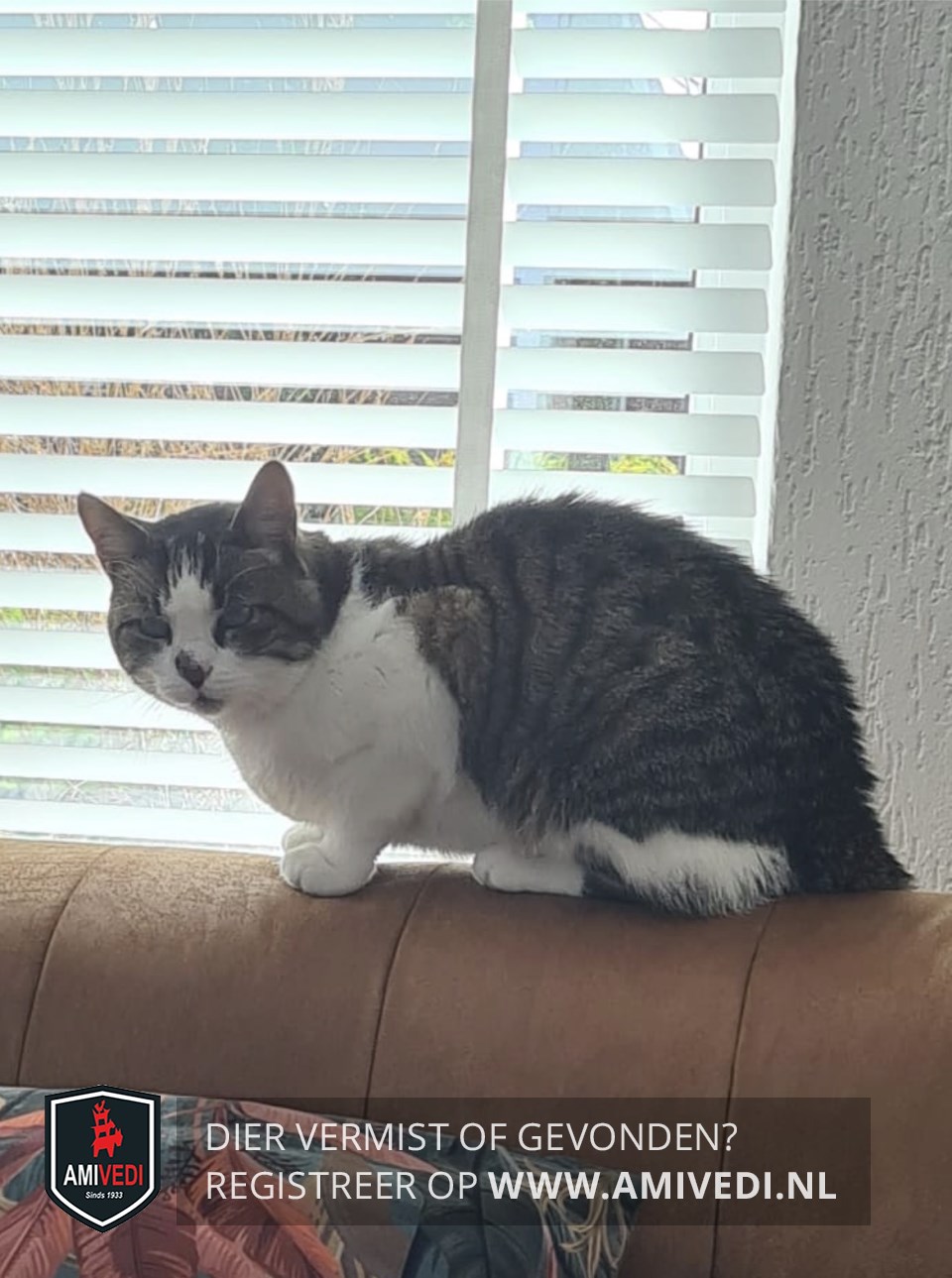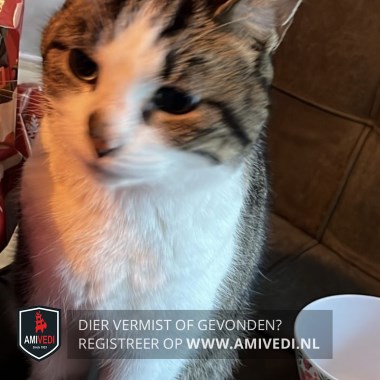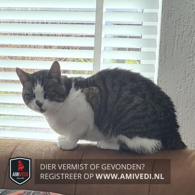 | Signalement | Cypers bruin/zwart met wit. Bruin/zwart bovenop de kop, oren, boven en onder de ogen en zijkanten kop. Tussen de ogen breed vlak wit tot en met de neus. Rechts op de neus bruin/zwart vlekje. Witte aan beide kanten van neus en bek, witte kin, bef, borst en buik. Bruin/zwarte rug, zijflanken en staart. Zijflanken ter hoogte van de voorpoten wit. Witte voorpoten, bij rechtervoorpoot een langwerpige bruin/zwarte vlek op onder poot en binnenzijde. Is aan de magere kant. Als hij zijn staart omhoog heeft staat die al dichtbij zijn rug. |