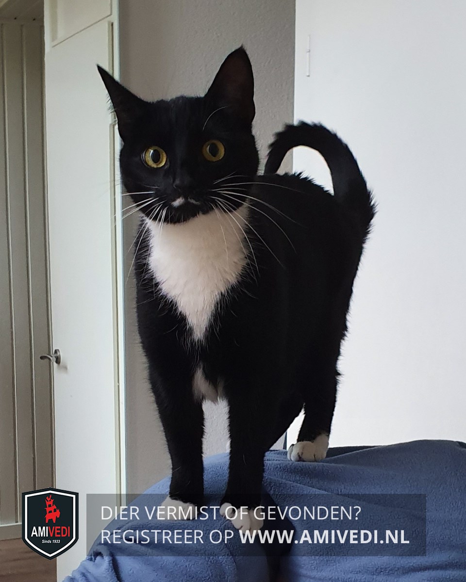 | Signalement | Zwarte kop, bij de lipjes dunne witte streepjes. Zwarte rug, zijflanken en staart. Witte bef wat in een punt naar de borst loopt. Tussen de voorpootjes wit. Zwarte poten met witte teentjes. Haar buik is aan de onderzijde zo goed als kaal en heeft een hangbuikje. |