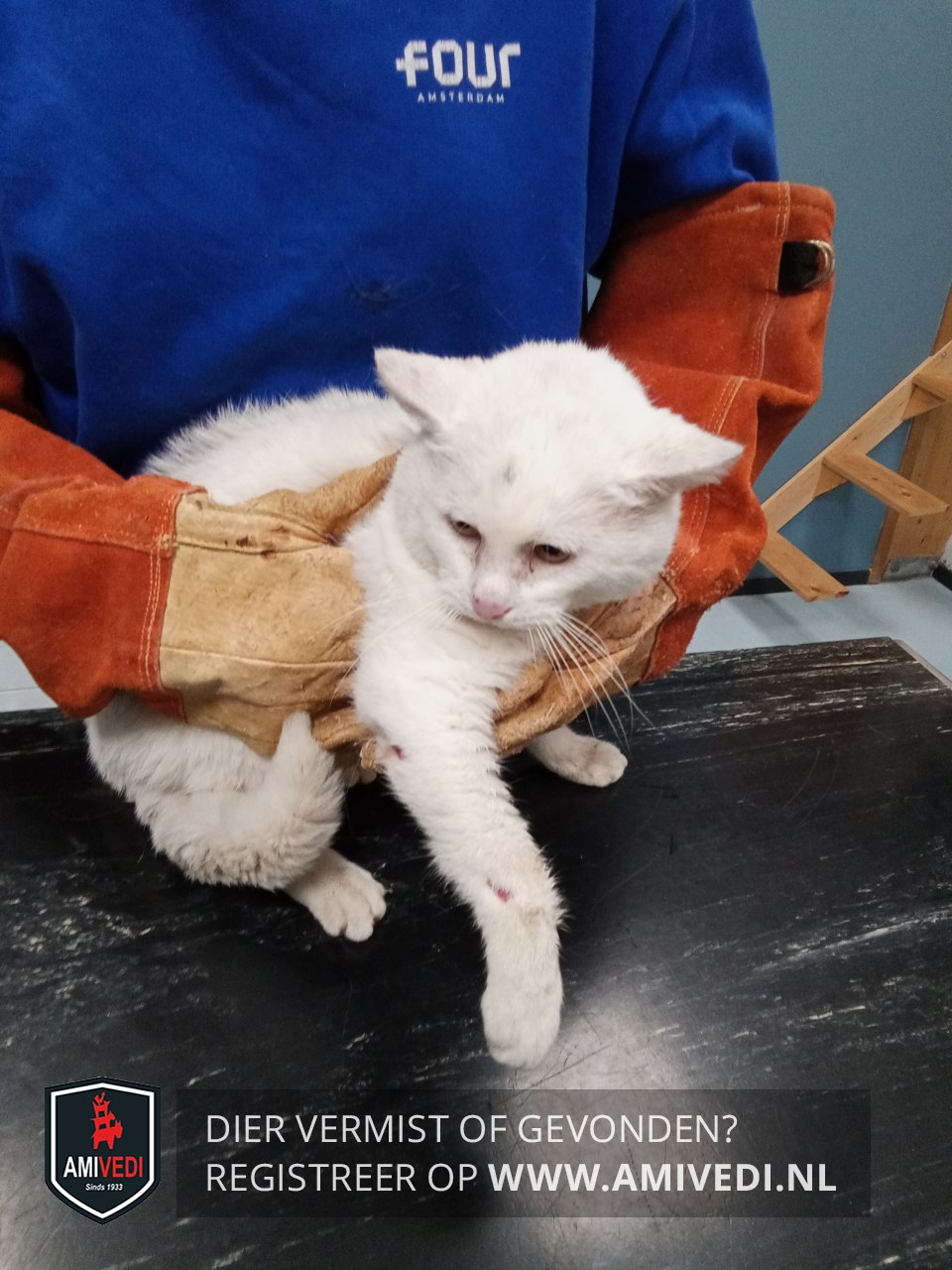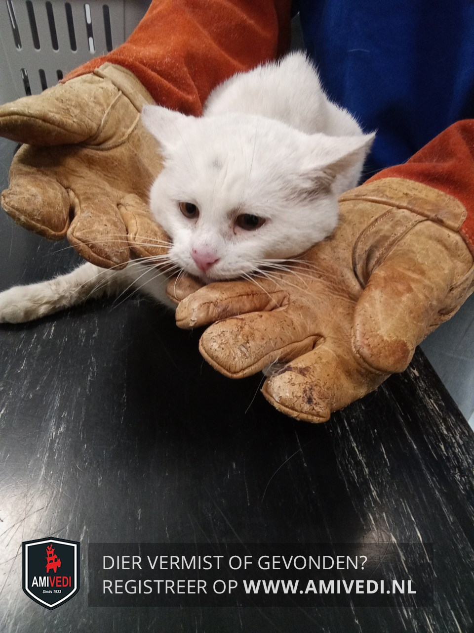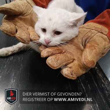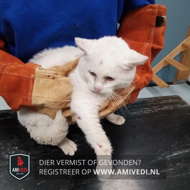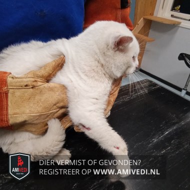 | Signalement | Witte kat met paar zwarte haartjes op het kopje. |