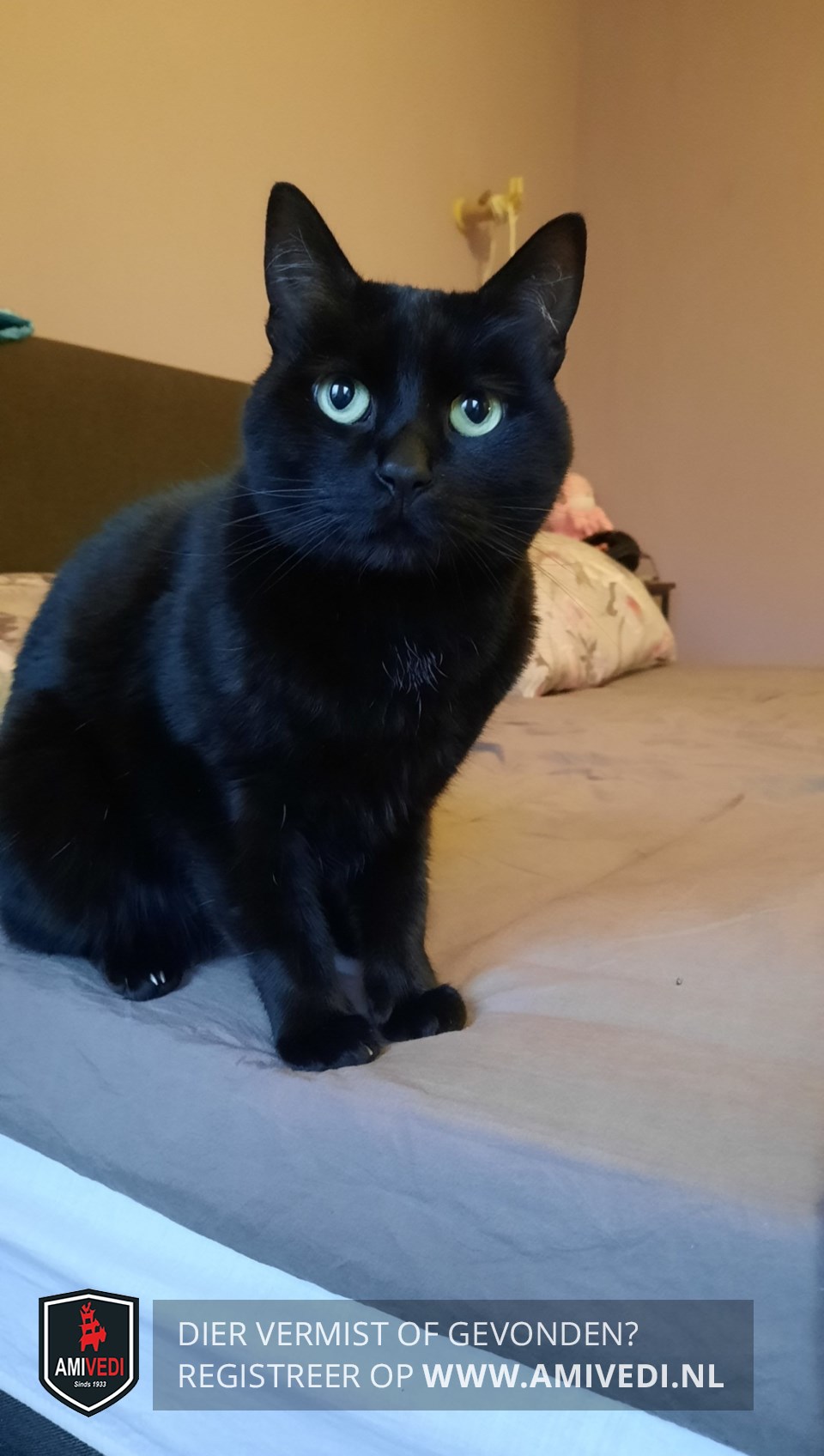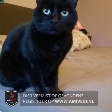 | Signalement | Zwart met klein wit vlekje onder zijn kin en op zijn buik. |