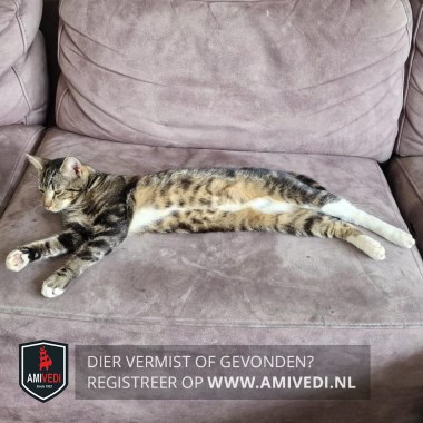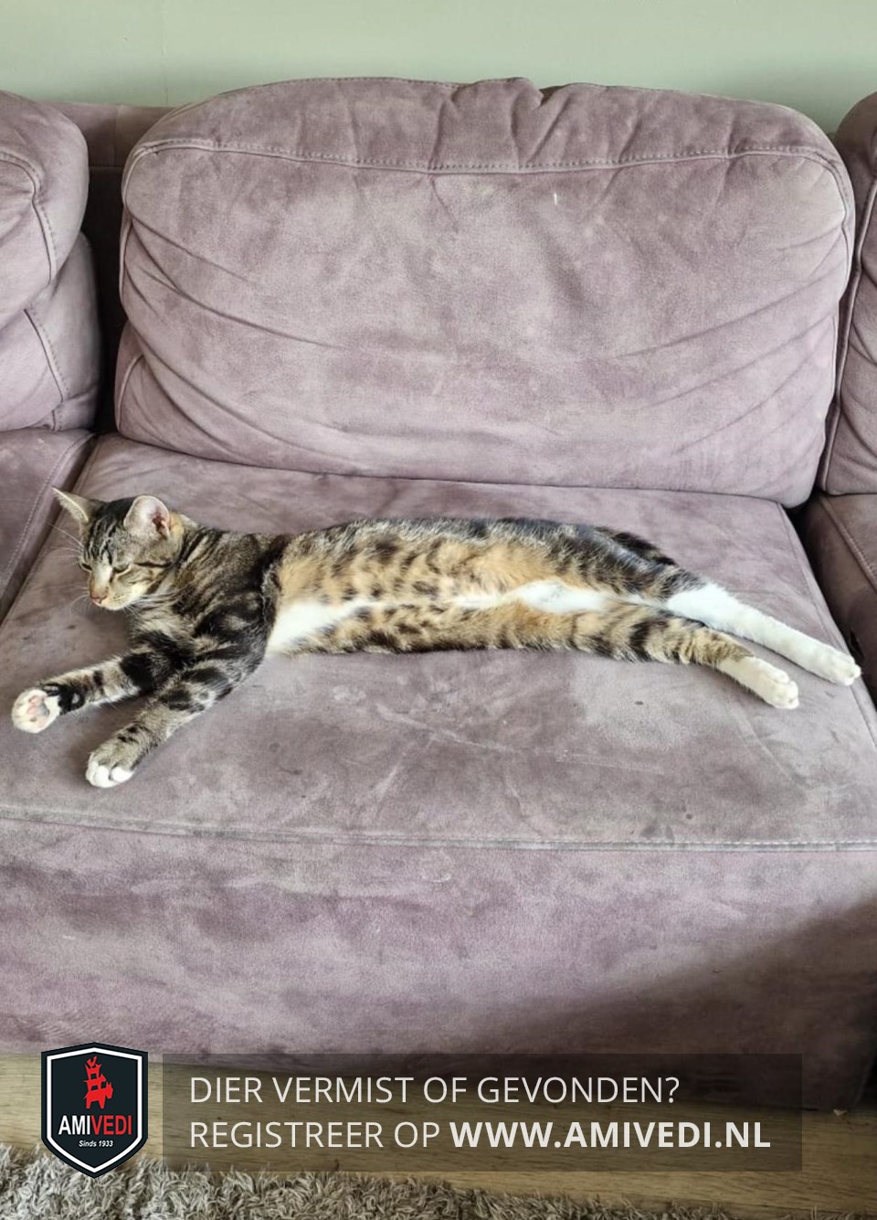 | Signalement | Slanke kater, bruin/zwart gestreept met witte pootjes en een wit puntje aan het uiteinde van zijn staart. |