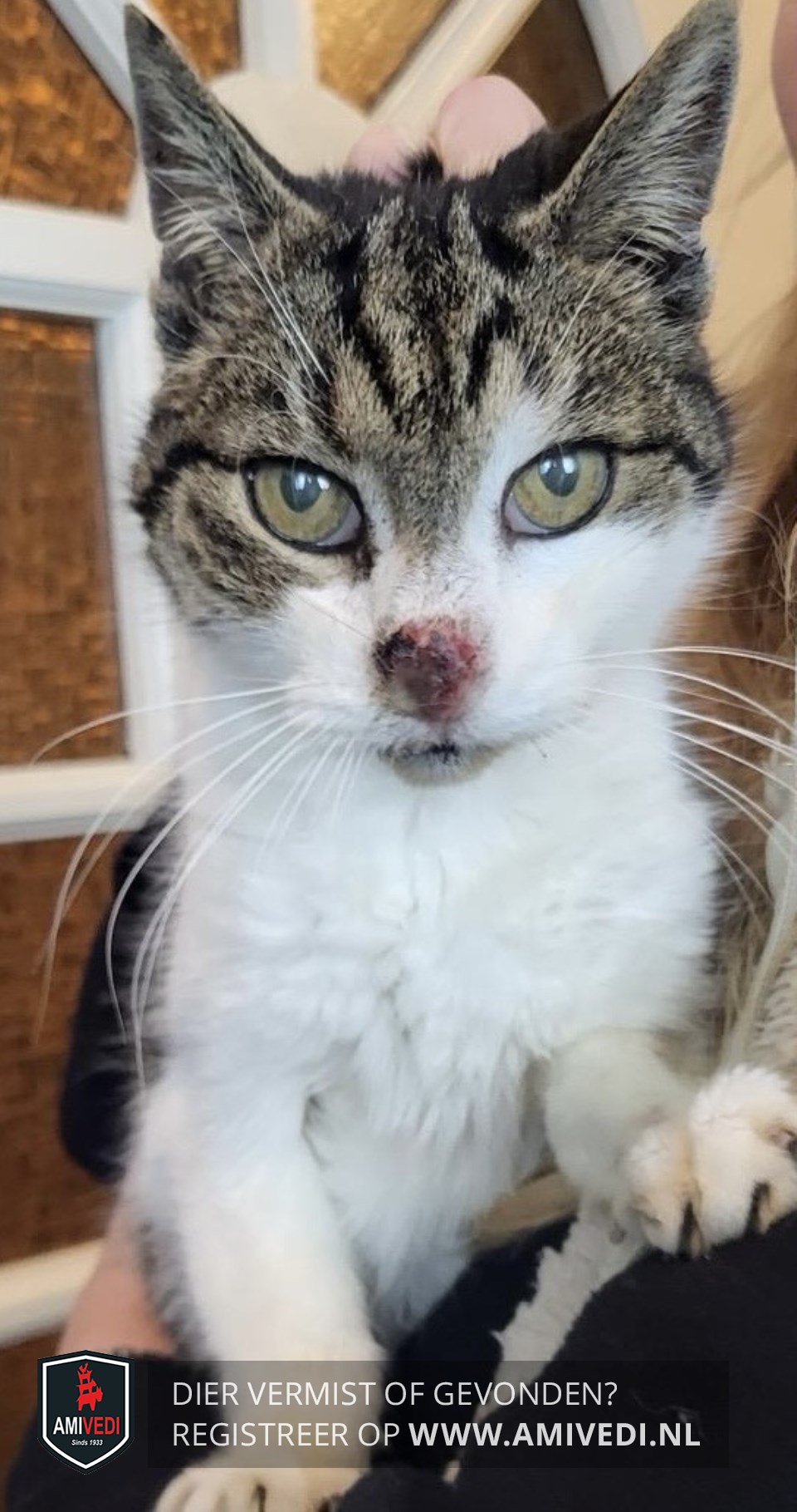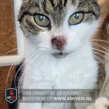 | Signalement | Bruin/zwart Cypers kat met wit. Witte snoet, bef en borst. Cypers vanaf de ogen op de kop en oren. Witte voorpoten. Draagt een groene vlooienband. |