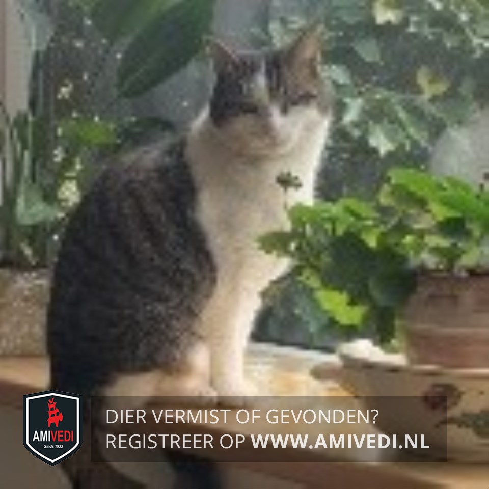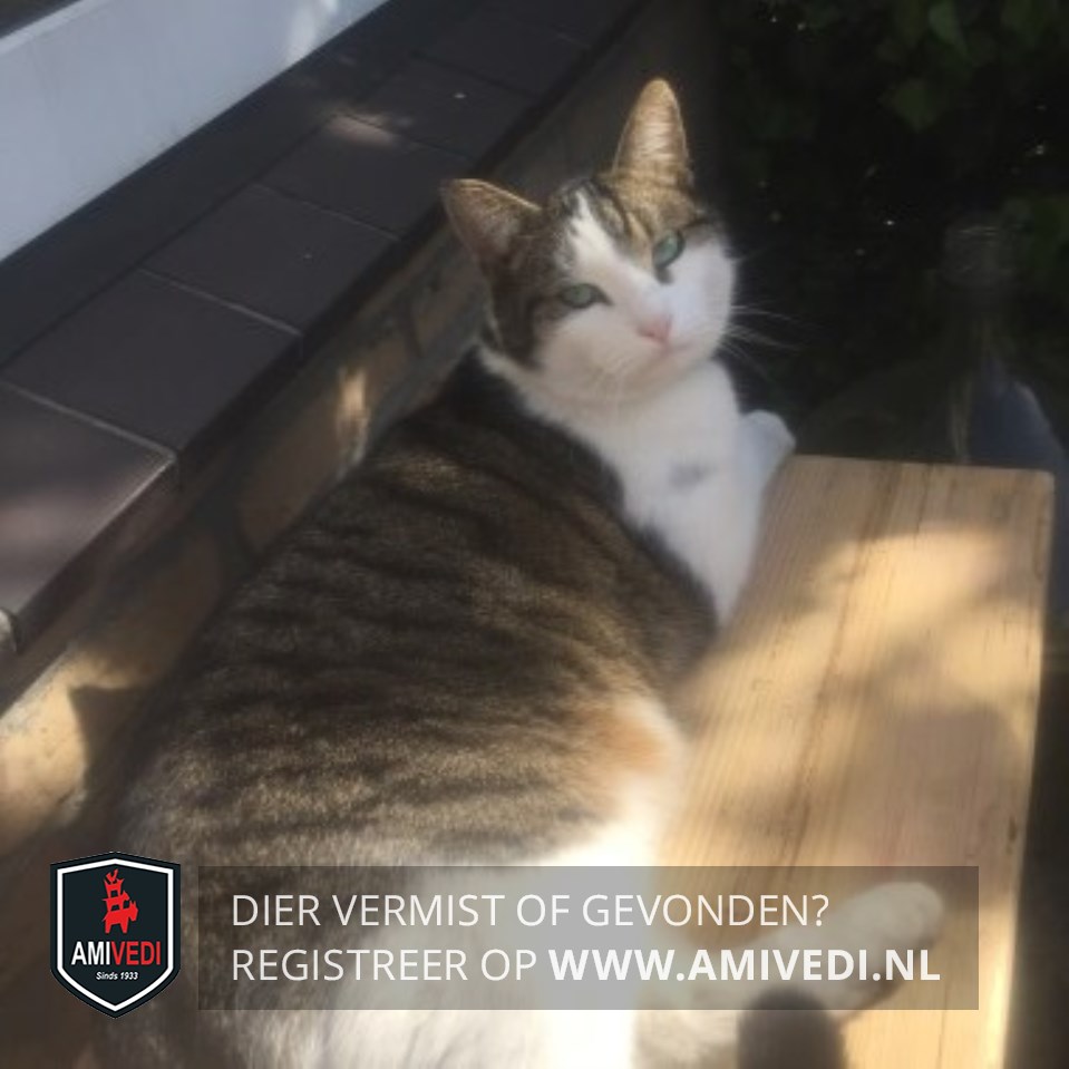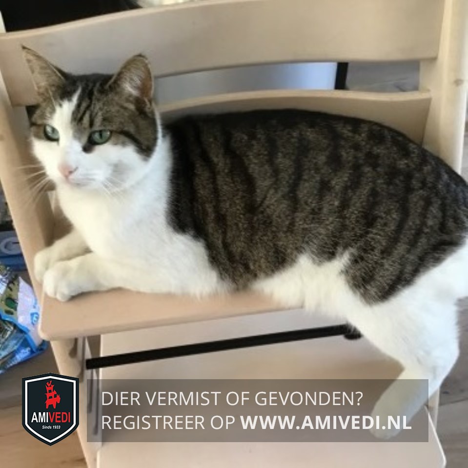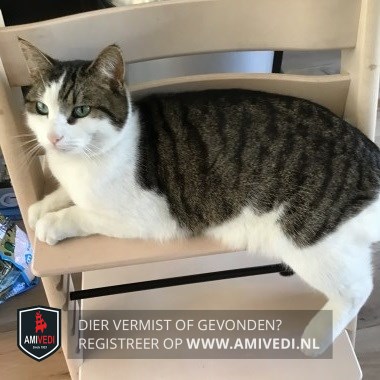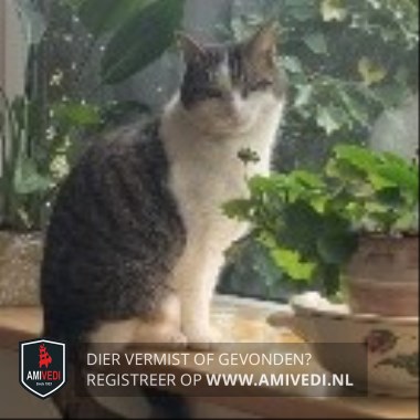 | Signalement | Zwart/grijs gestreepte kater met wit, witte bles (rechts meer wit dan links), witte borst, voorpoten, buik en achterpoten, rug, staart en flanken zijn grijs/zwart, groene ogen |