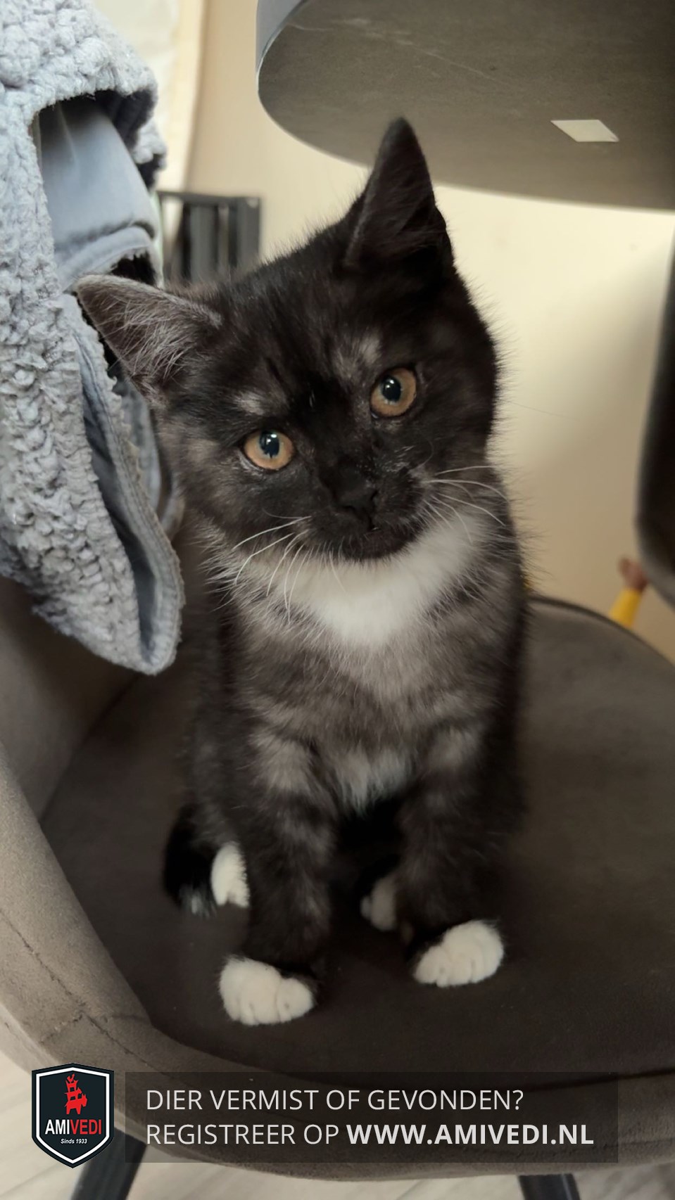 | Signalement | Zwart - grijs met witte bef, witte tenen voorpootjes, witte voetjes achterpoten. |