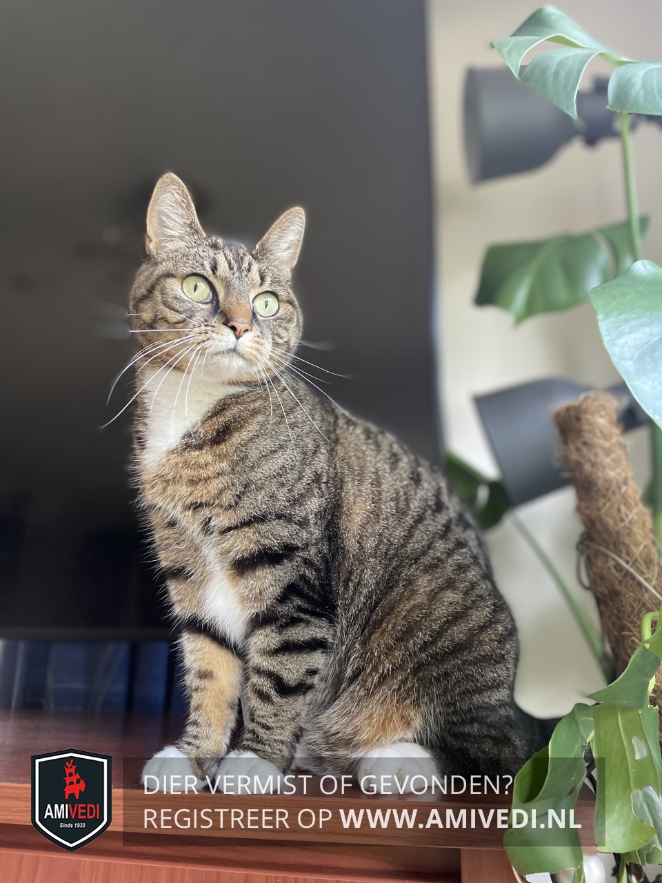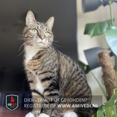 | Signalement | Cypers bruin zwart gestreept met wit Wit snorretje, wit kinnetje, witte borstvlek die tussen de voorpootjes naar een witte vlek tussen de voorpoten loopt, eitte voetjes voor, witte voetjes achter. |