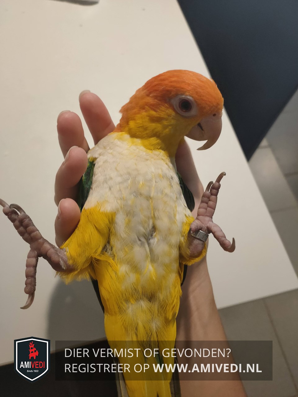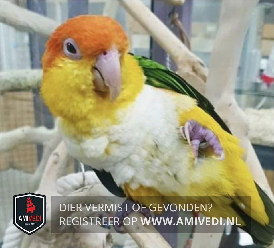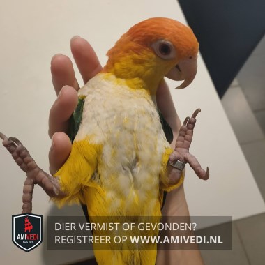 | Signalement | Groen/geel/oranje met wit . Oranje kop. Gele wangen en keel. Wit op de borst en buik. Groene vleugels. Gekortwiekt. Heeft een ring. Witbuik-caique. |