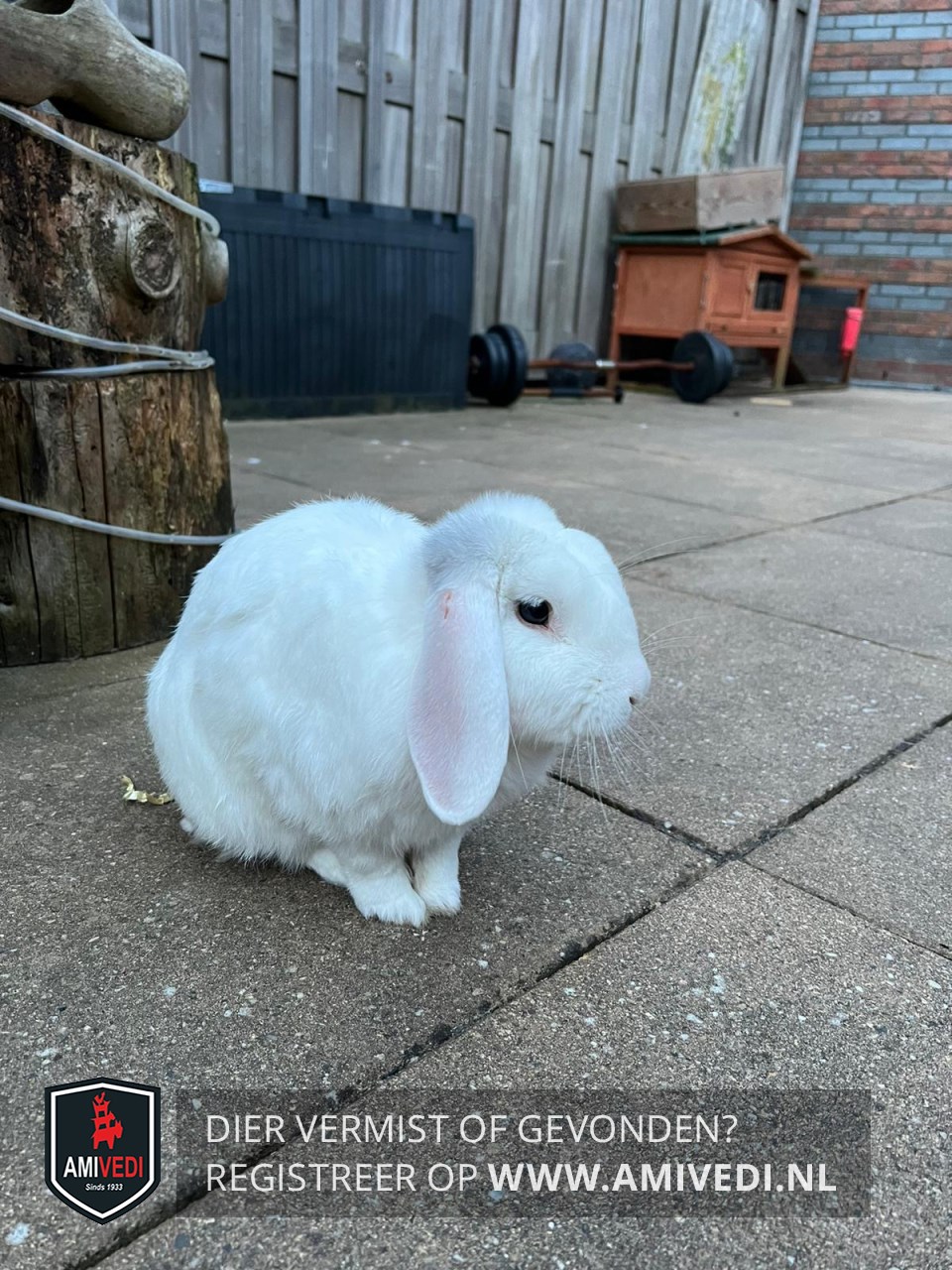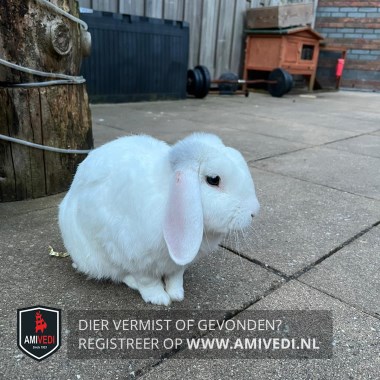 | Signalement | Witte franse hangoor met een lichte grijze streep / plukje haar op zn hoofd |