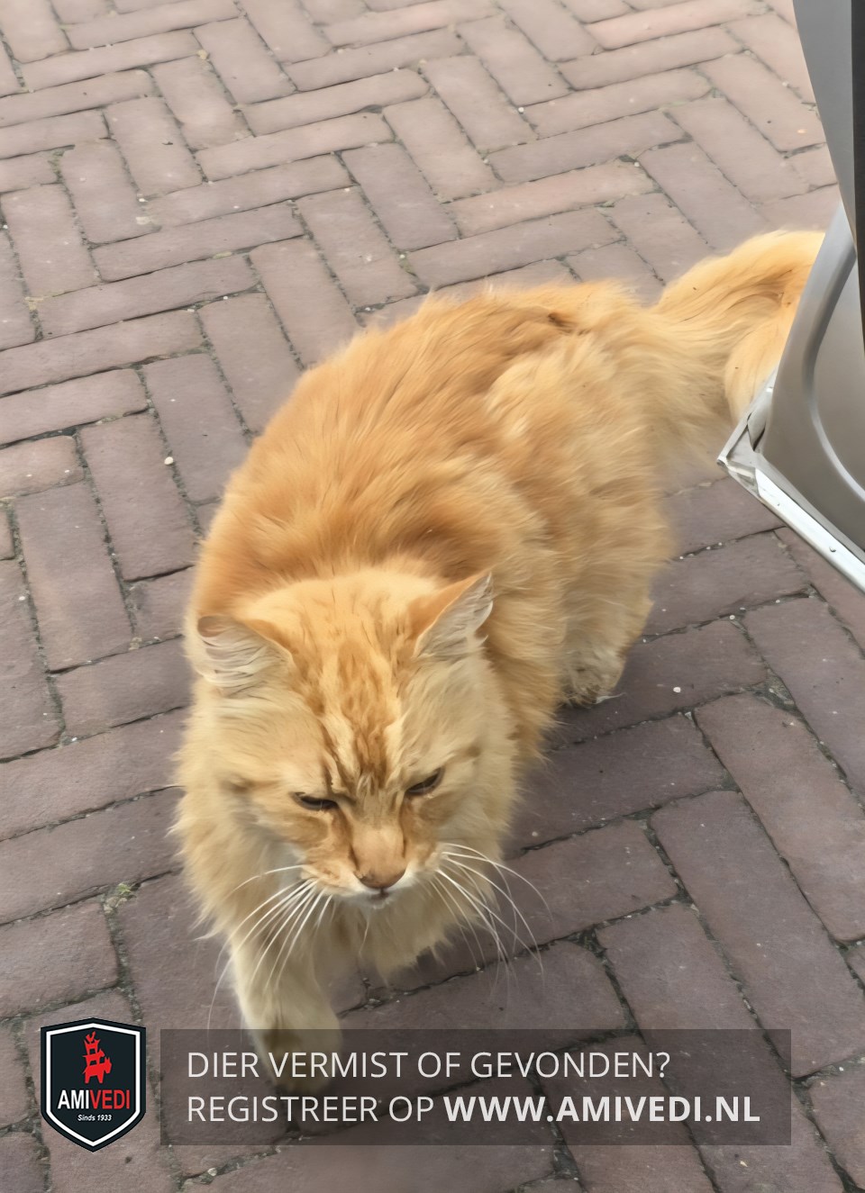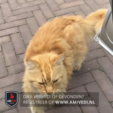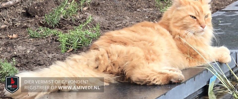 | Signalement | Rode Maine Coon, De vacht vanTom is 6 weken geleden door de dierenarts geschoren, onder op zijn buik en voor een deel de staart. Hij draagt de staart schuin, vanwege een oude breuk. |