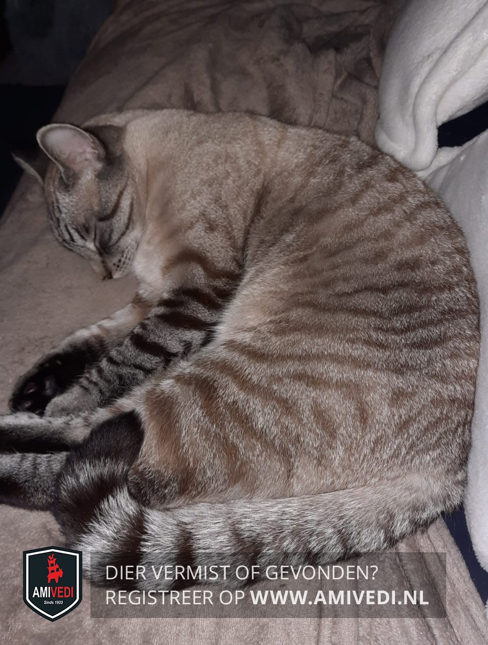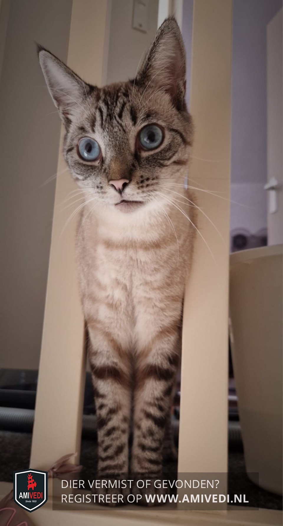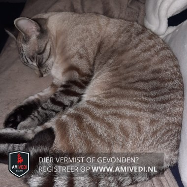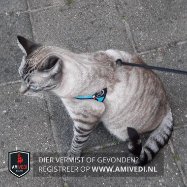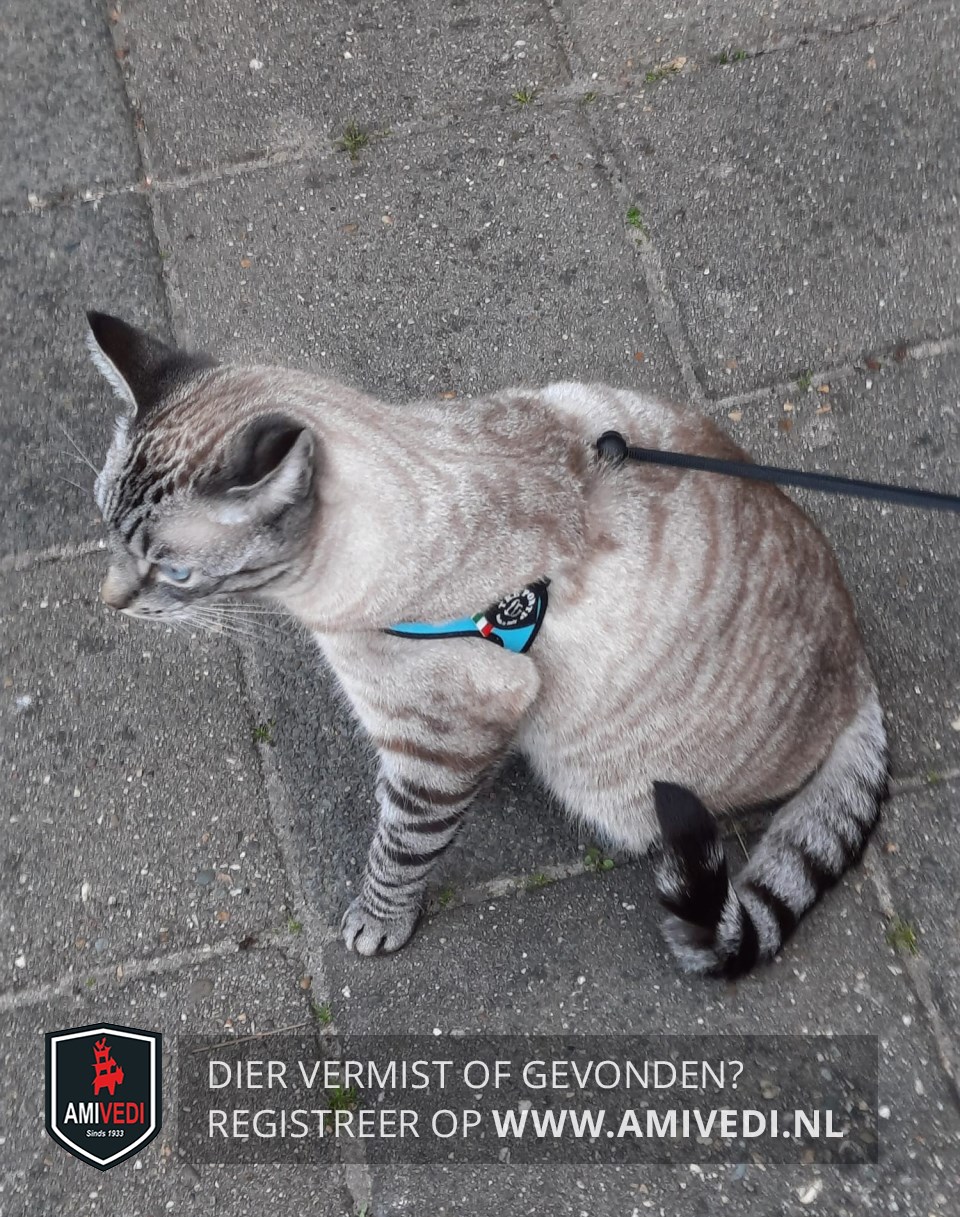 | Signalement | Volledig cypers grijs/zwart/beige. Zwart gestreept bovenop de kop. Lichte borst. Poten grijs/zwart gestreept. Blauwe ogen. |