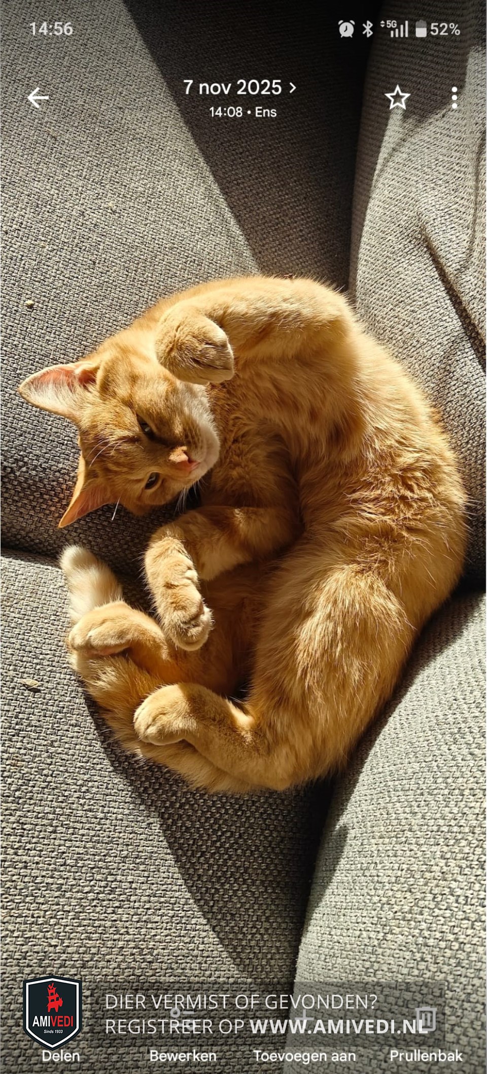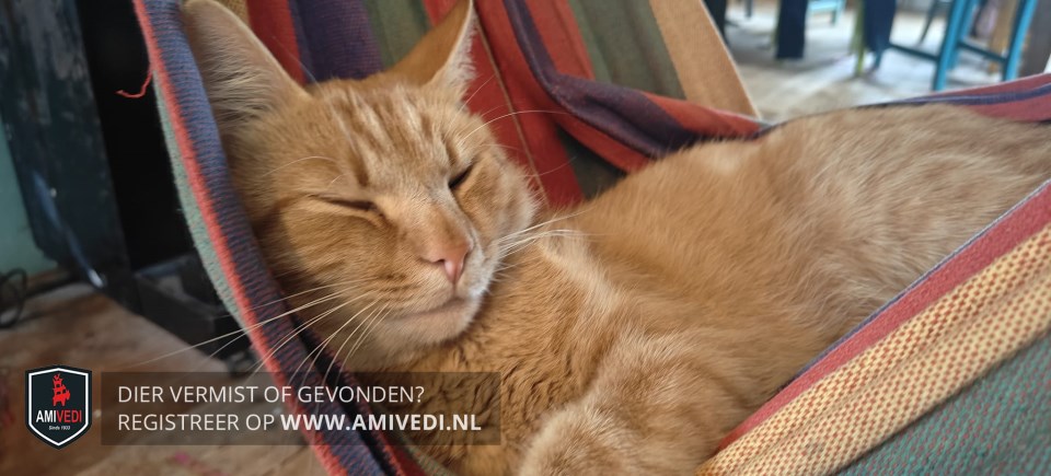 | Signalement | Geheel rood gestreepte kater uit een kruising met een siberische kat, daardoor heeft hij wat langere plukken haar op zijn wangen. Gele ogen, roze neusje en witte snorharen. |