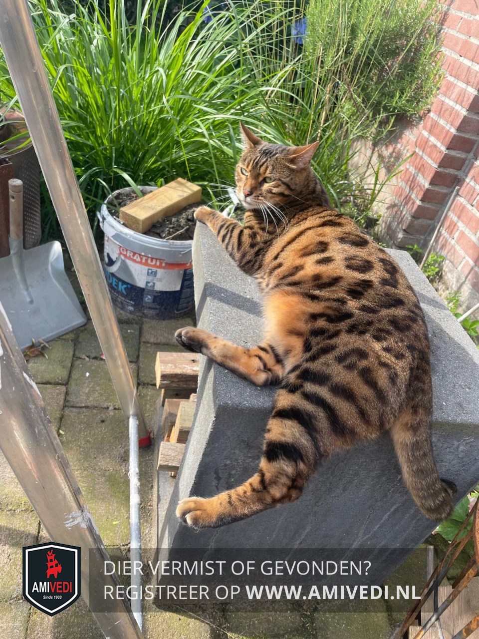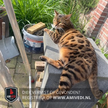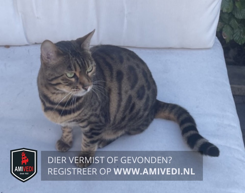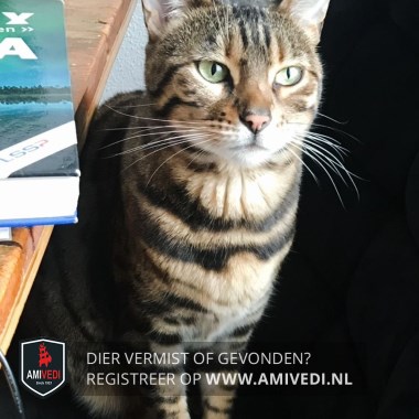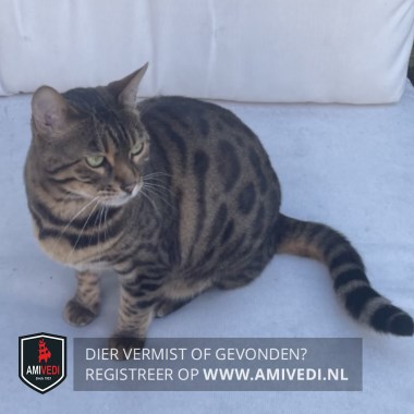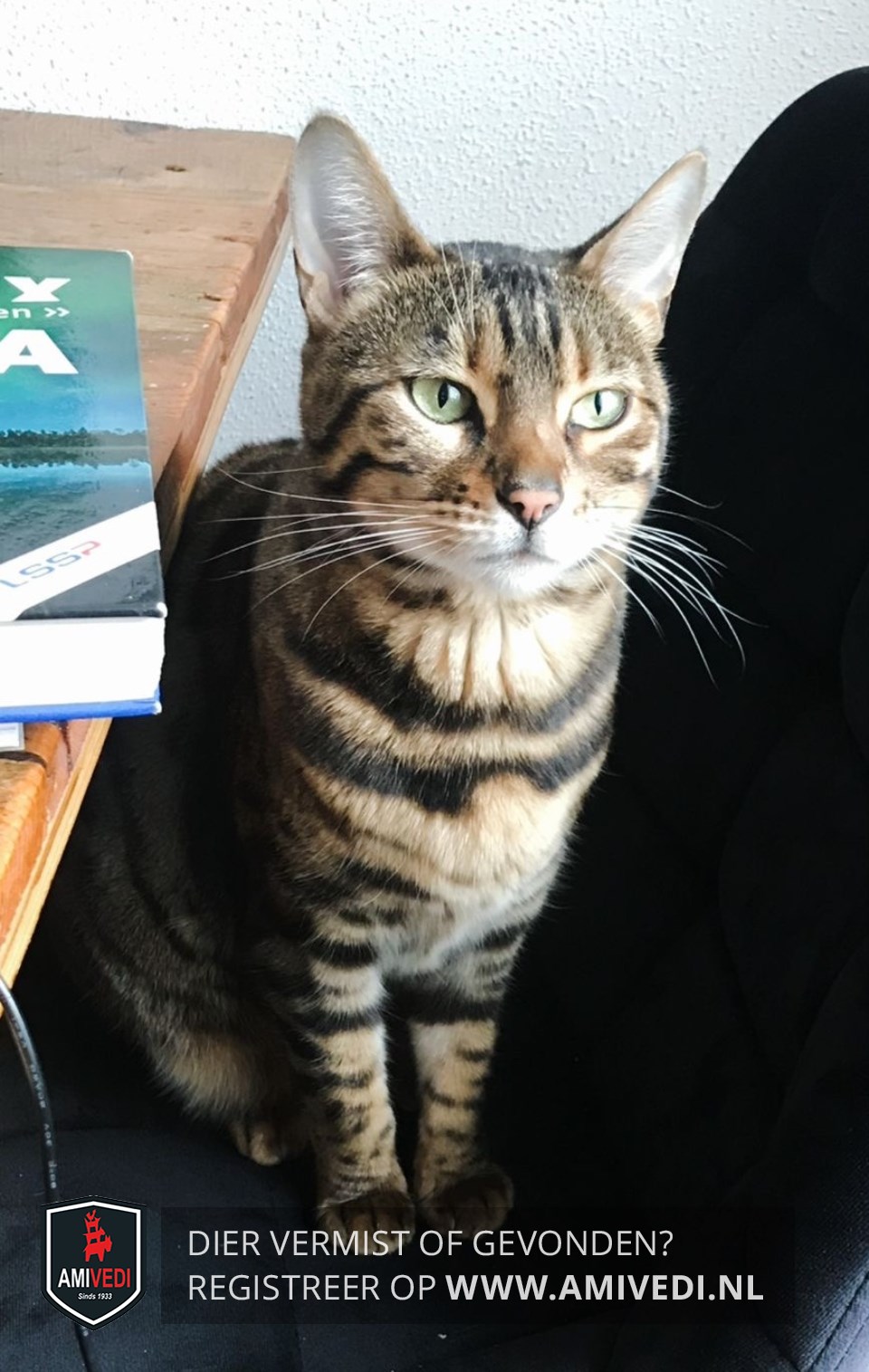 | Signalement | Bengaalse poes, bruin met zwart en wit. Onder de neus wit en witte kin. Kopje, borst, voorpoten en staart bruin met zwart gestreept. Lijfje bruin met zwarte vlekken. Is niet gewend op straat! |