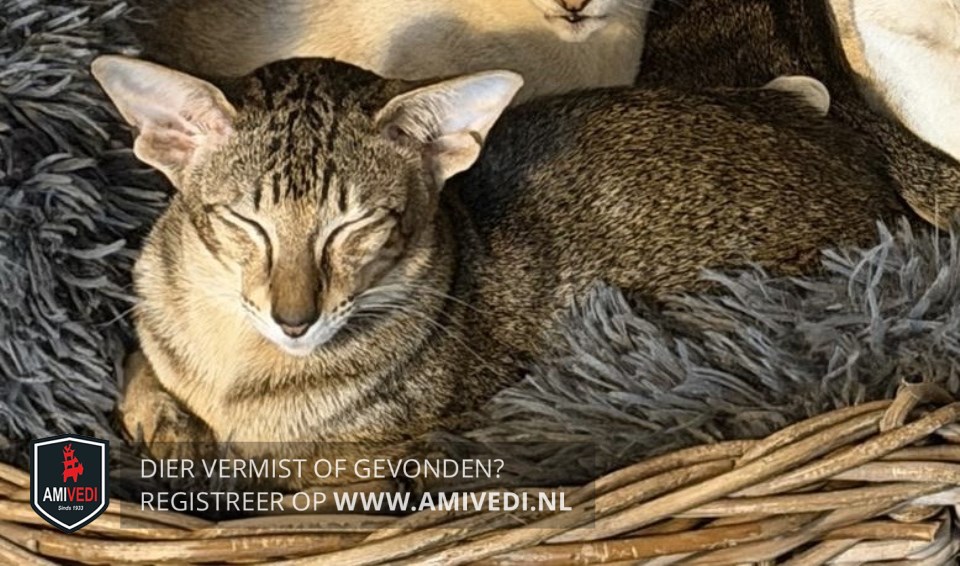 | Signalement | Black tabby blotched grijs - zwart met bruin, grote oren, spitse snuit, wit onder de neus, witte kin. |