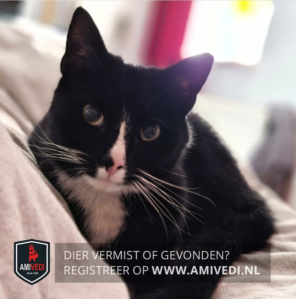 | Signalement | Grotendeels zwart met een witte bles op z'n neus wit snorretje. Witte kin en bef. Witte vlek op pootje. Witte snorharen. |