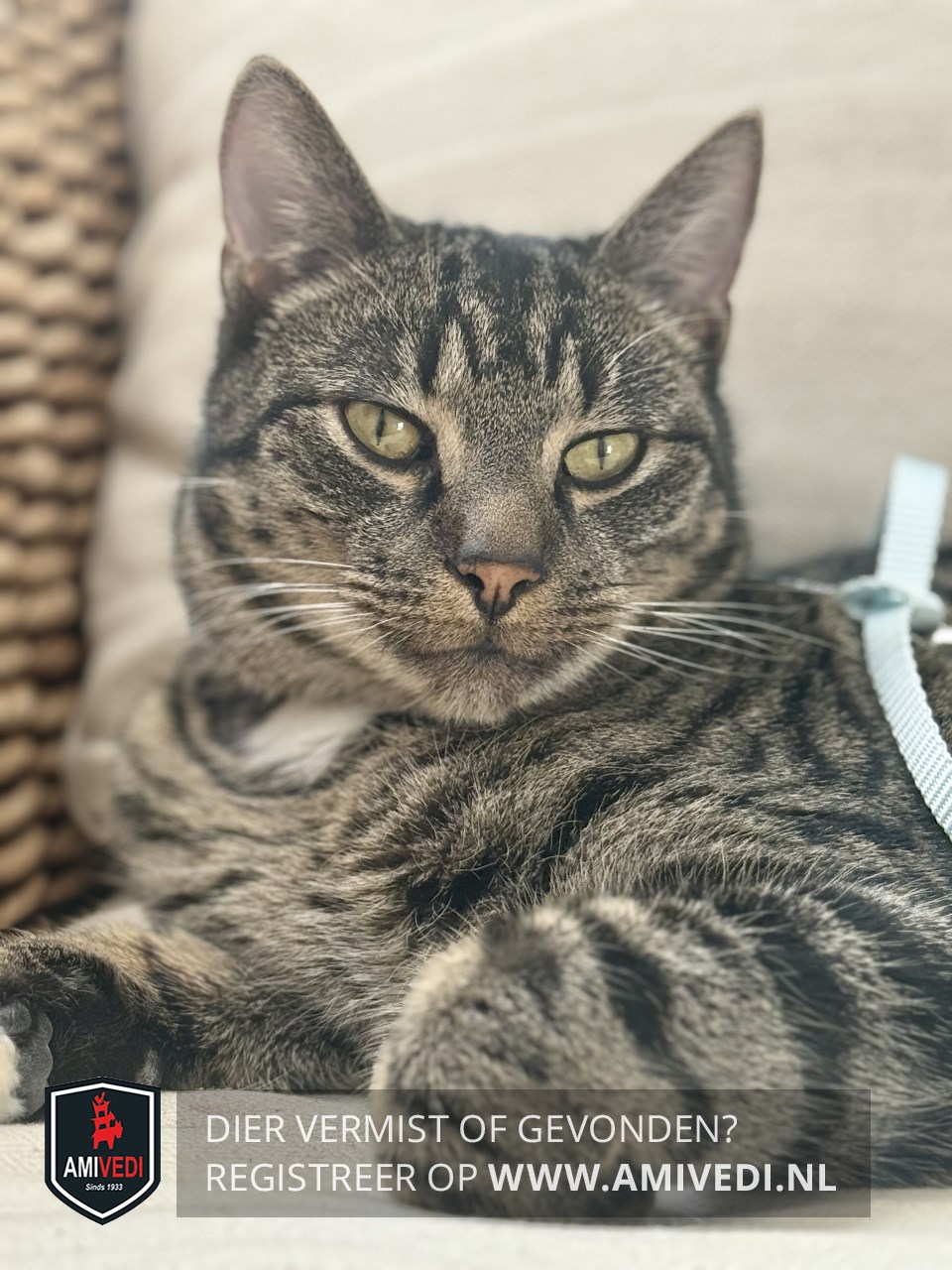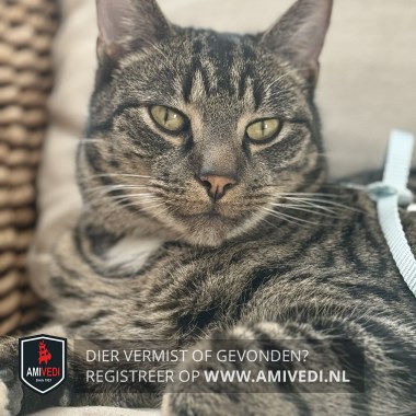 | Signalement | Cypers bruin zwart gestreepte kater met wat wit aan de kin en wat wit op de bef, voor de rest geheel cypers gestreept. |
