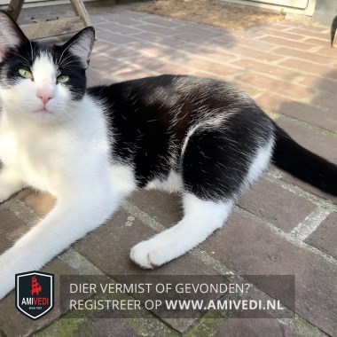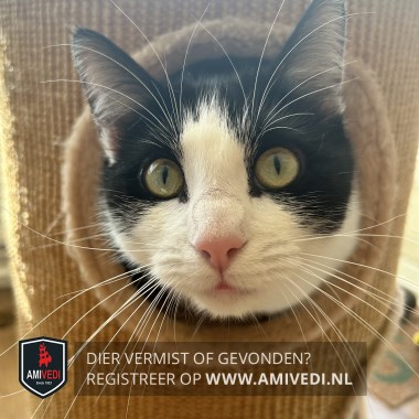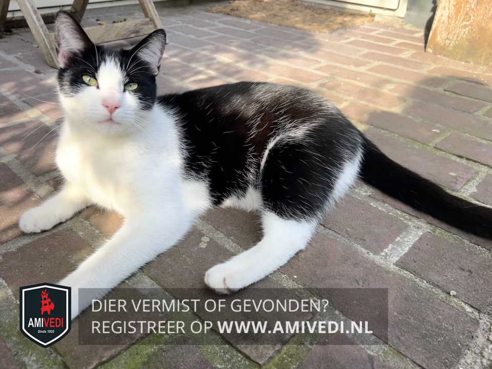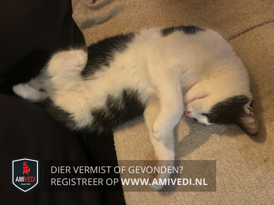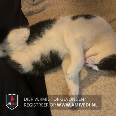 | Signalement | Zwart witte grote kater. Zwart bovenop de kop, oren en rondom de ogen. Mooie felle ogen. Witte streep vanaf het voorhoofd over de neusbrug, rondom de neus en bek. Rechts en links van de bek is het wit. Spits kopje. Witte kin, bef, borst en buik. Zwarte rug met witte haartjes door de zwarte vacht. Zwarte staart. Witte poten. |