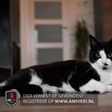 | Signalement | Zwarte poes met witte bles, snuit (zwart vlekje links onder neus en op kin) Witte kaaklijn, keel, kraag, bef, borst, buik. Voor witte poten (rechtsvoor met zwarte vlek achterzijde), achter witte kniekousen. |