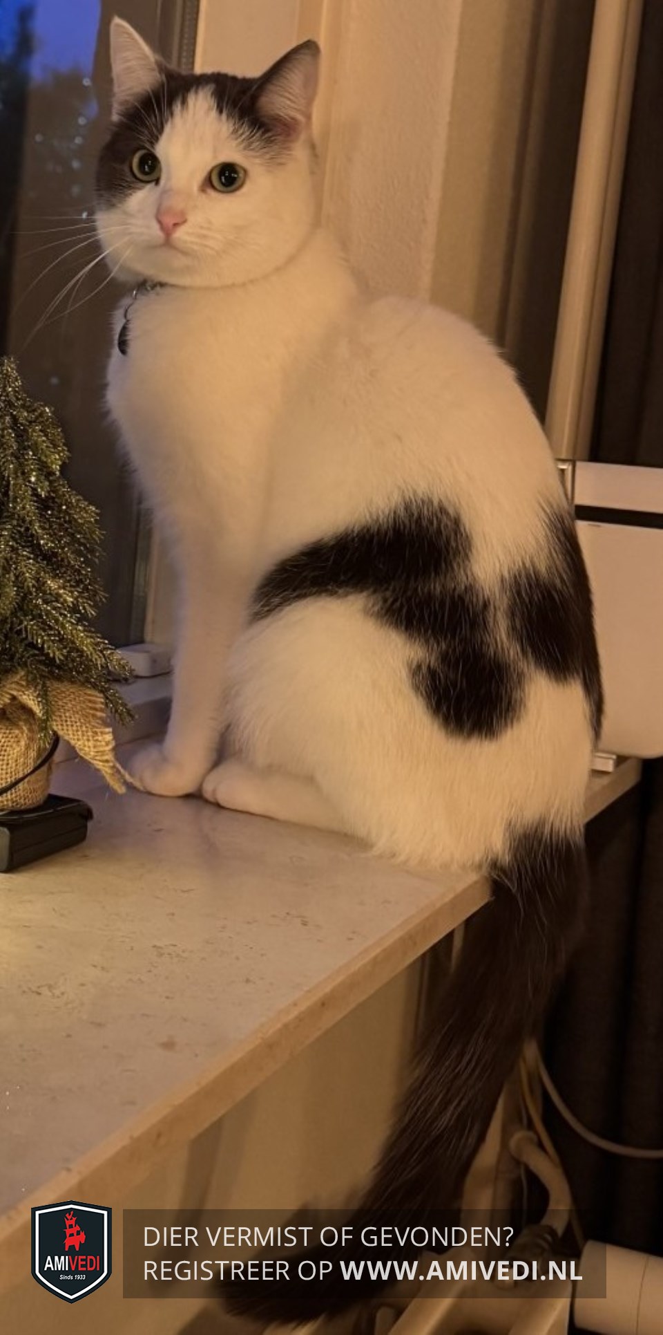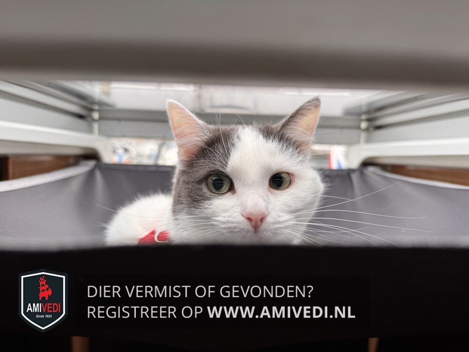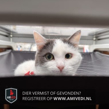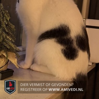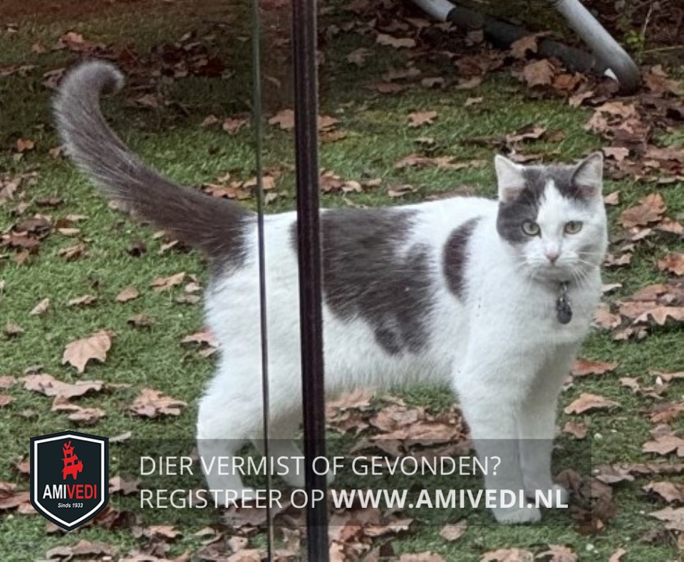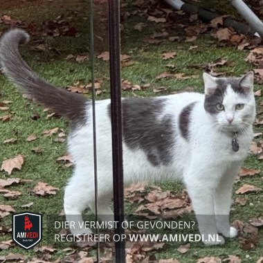 | Signalement | Witte kat met grote grijze vlek op het kopje en op de rug wat grijze vlekken. Grijze staart met wit puntje. |