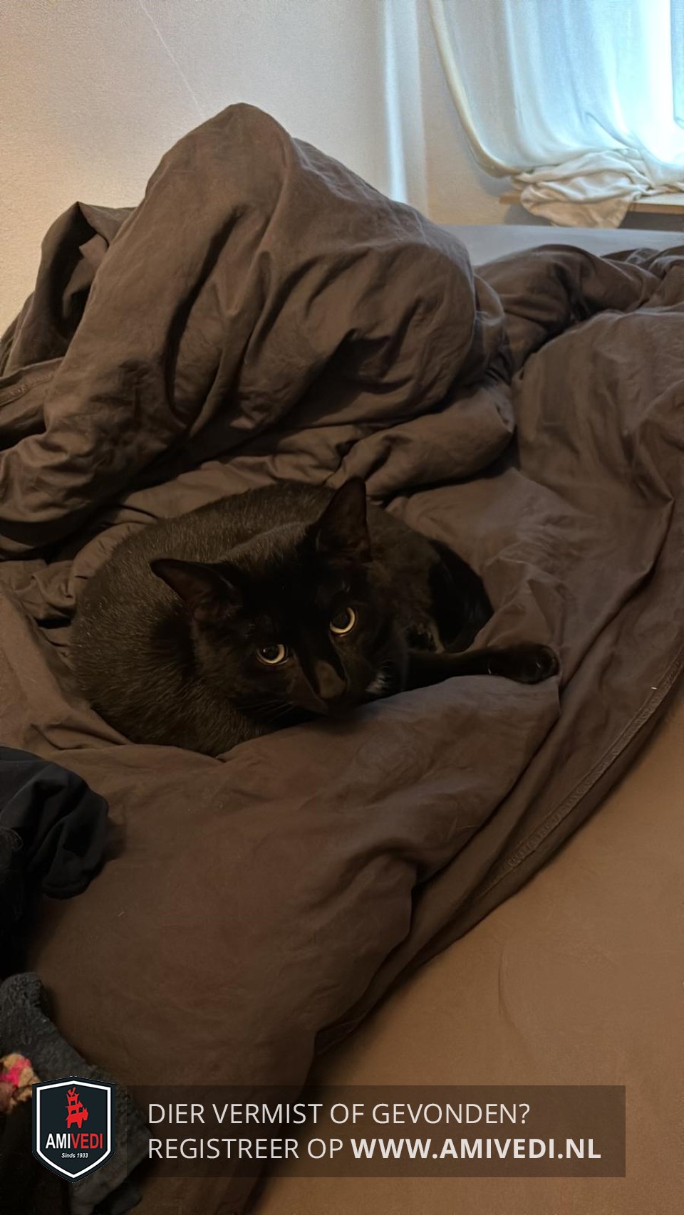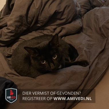 | Signalement | Zwarte kat met klein wit plekje op befje. |