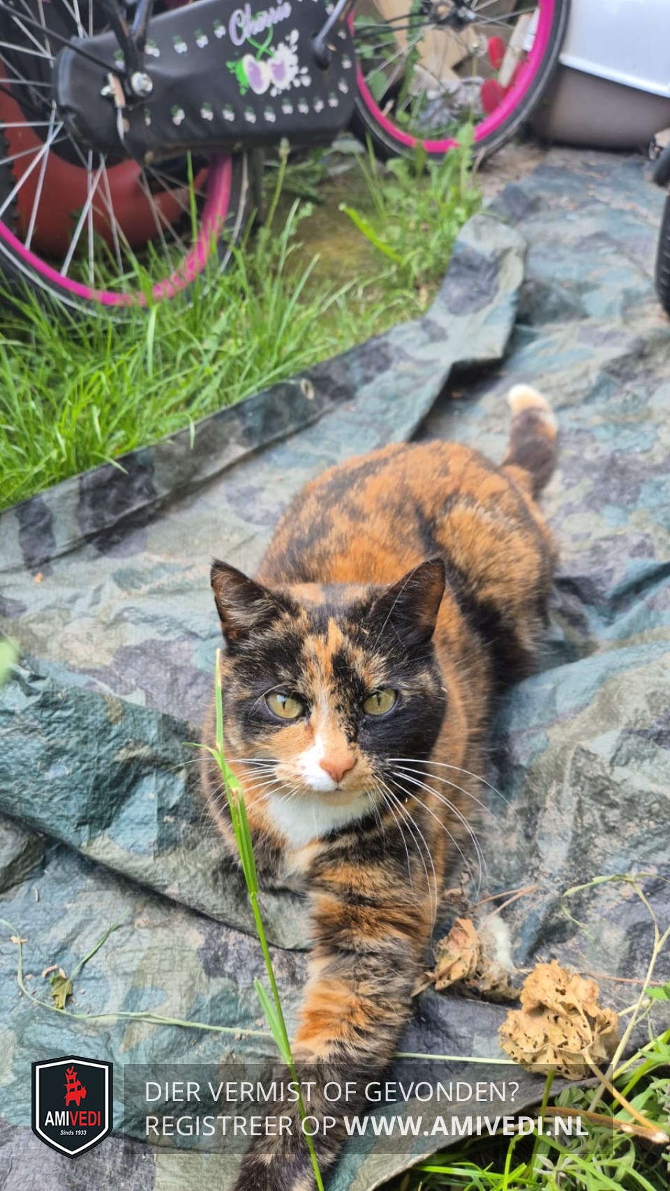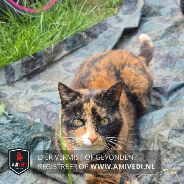 | Signalement | Schildpadpoes, rood- zwart gekleurde kop en lijfje. In het aangezicht een witte streep van net onder de neus richting voorhoofd. Groene ogen, roze neusje en witte snorharen. Wit op de kin en op de borst en aan de staart een wit puntje. Kenmerkend is haar verlamde (hangende) staart en ze loopt mank. |