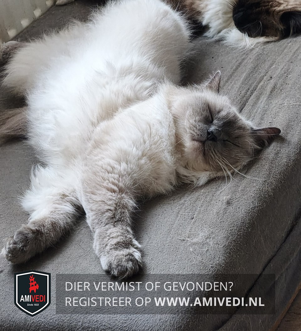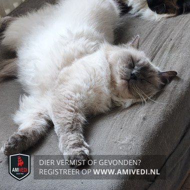 | Signalement | Colourpoint lilac point, wit met grijze snoet, oren, pootjes en staart, helder blauwe ogen, slank. |
