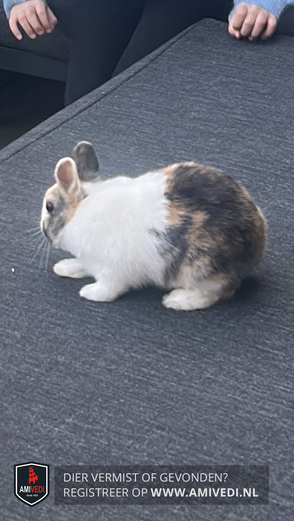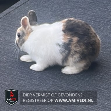 | Signalement | Jong konijn met op de kop, oren en wangen de kleuren bruin en zwart, in het aangezicht is het wit (zo te zien op de foto). Ook vanaf de onderrug is de achterzijde bruin en zwart. Verder is hij wit, witte pootjes. |