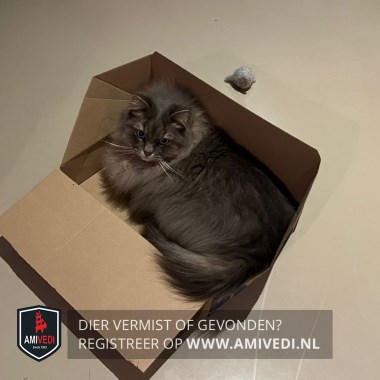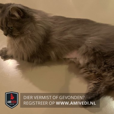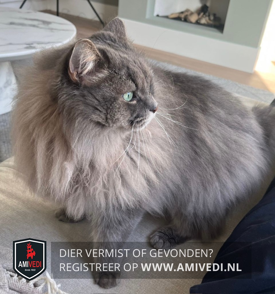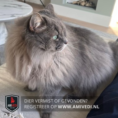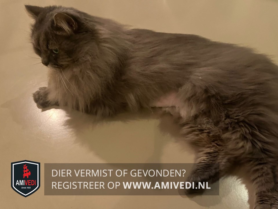 | Signalement | Volledig grijs met een lichte kraag. Felle groene ogen. Is recent bij de trimster geweest en daar aan een kant kortgeschoren. |