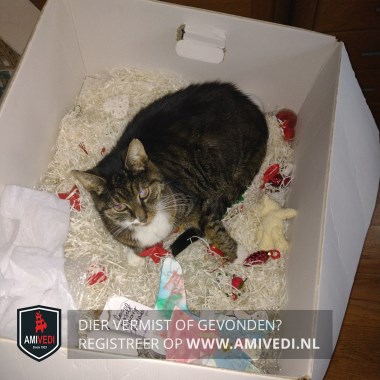| Signalement | Cyperse, redelijk grote poes met donkerbruin/zwart gestreepte vacht, groen/geelachtige ogen, een klein wit vlekje rechts naast haar neusje en witte bef die doorloopt over de borst. kale plek achter op de rug en een donkere, gestreepte staart. |