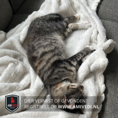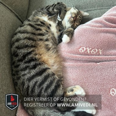 | Signalement | Cypers grijs/zwart met wit en bruin. Witte kin en bef. Witte vlek tussen de voorpoten, begin van de buik. Rechtervoorpoot witte tenen. Rechts voor en achter witte voetjes. Linksachter een witte sok. Wat bruin op de buik. |