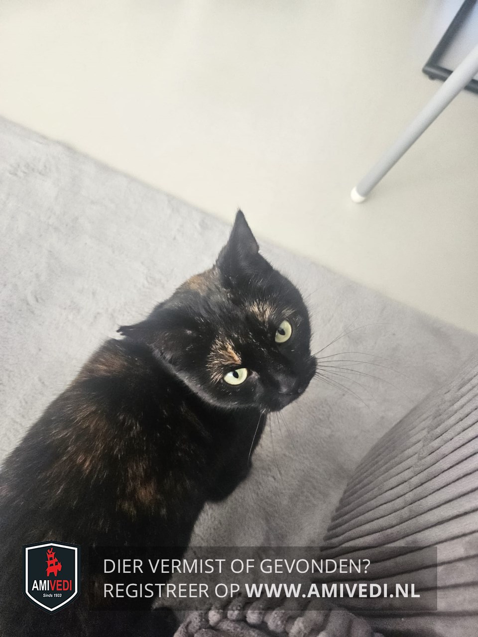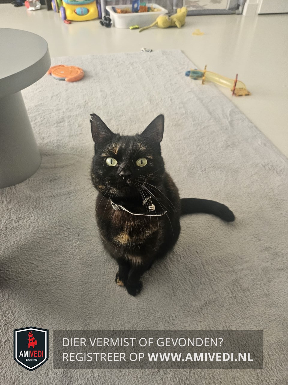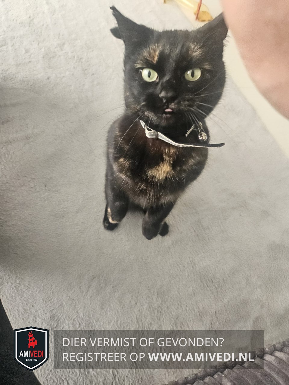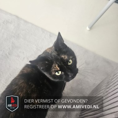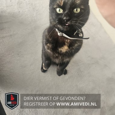 | Signalement | Schildpad poes in de kleur zwart oranje gemêleerd. Draagt een reflecterende zilveren halsband en zwarte vlooienband. Heeft een kleine inkeping in de punt van haar rechteroor. |