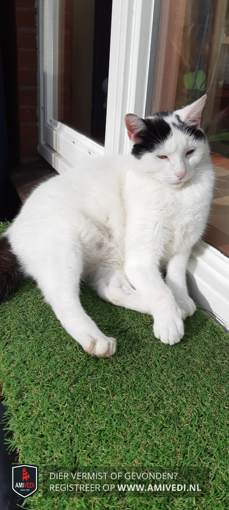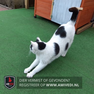 | Signalement | Hoofdkleur wit. Zwart rond de oren en nek, vlekken op het lijfje, staart. |