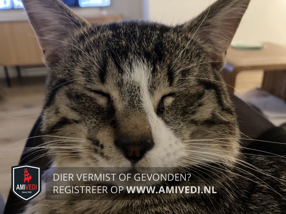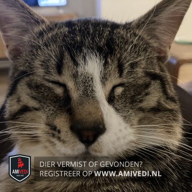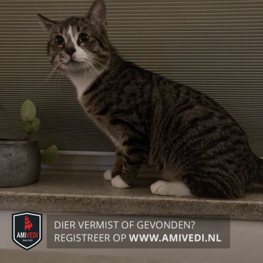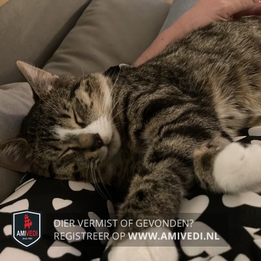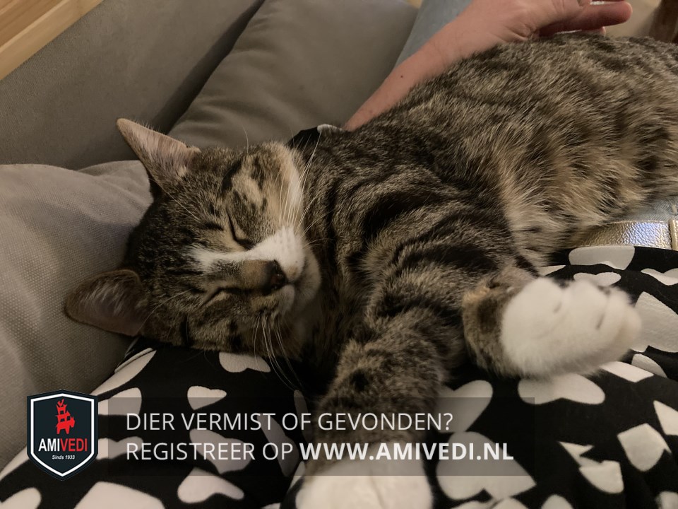 | Signalement | Tijgerachtige vacht. Witte streep over zijn kop en neus.Bruin neusje, vier witte pootjes alsof hij sportsokjes aan heeft, grote kater. |
