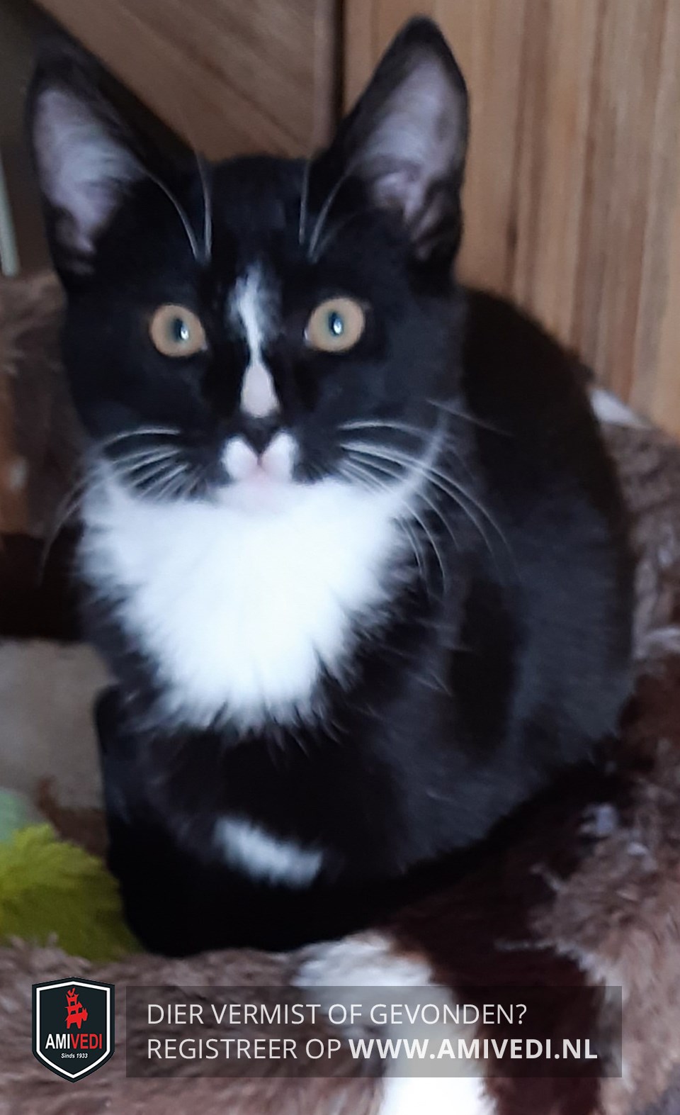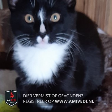 | Signalement | Zwart-witte kater. Witte smalle bles met zwarte neuspunt. Witte bovenlip en kin. Witte bef. Wit tussen de pootjes. |