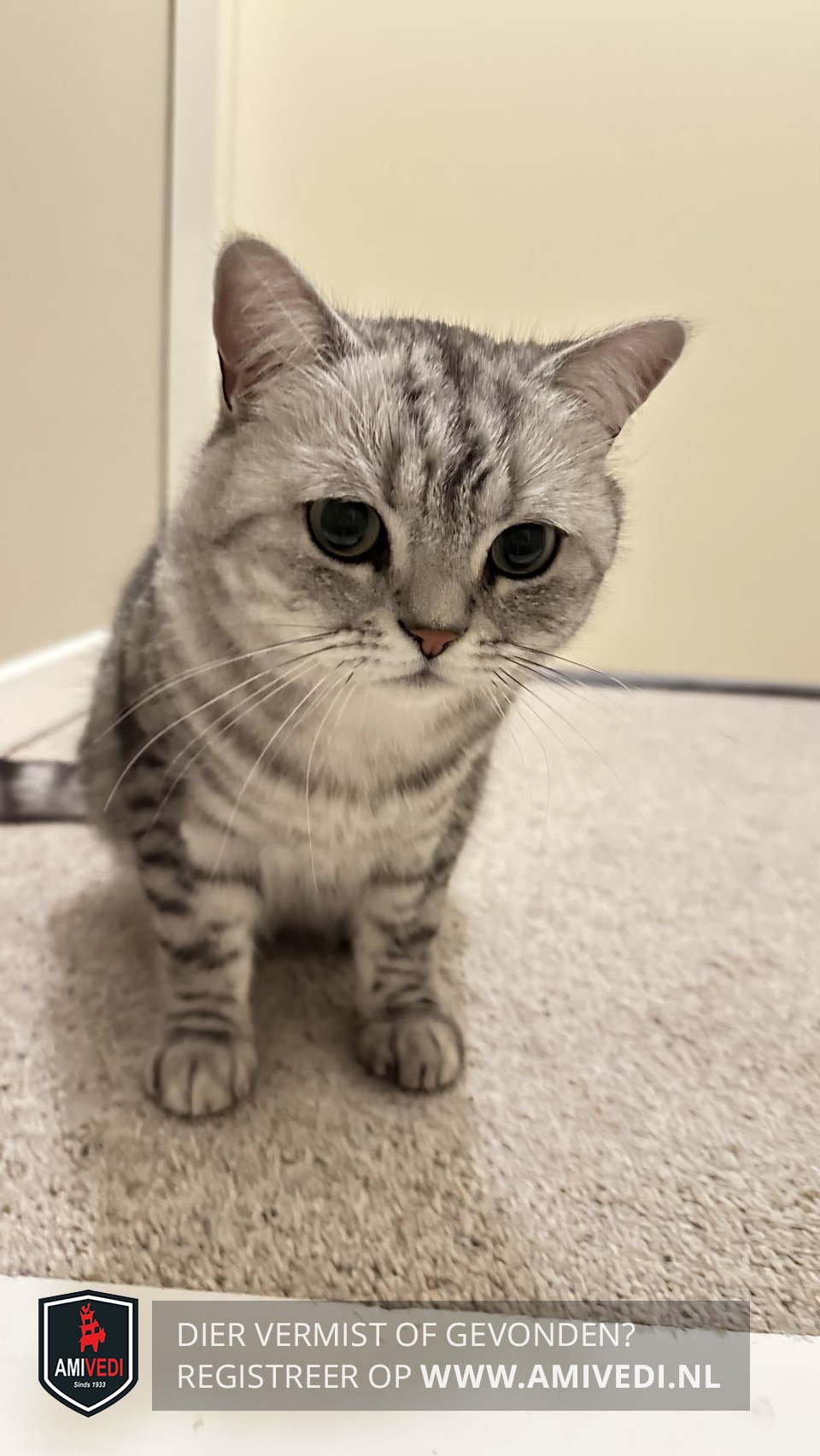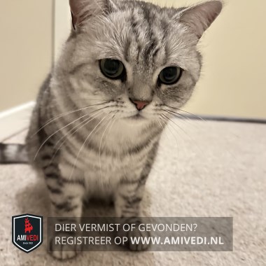 | Signalement | Britse korthaar kater. Cypers grijs/zwart/beige, grijs neusje, wit snorretje en witte kin. |
