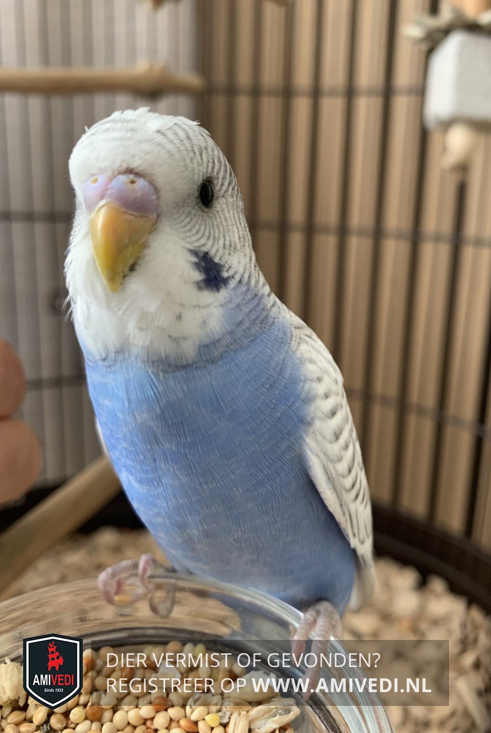 | Signalement | Witte kop, met donkerblauwe wang. Blauw lijfje. Grijs/witte vleugels. |